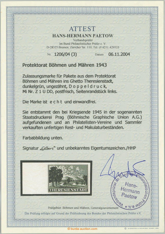 | Zusatzinformationen und Suchstichworte: | Burda 72. Auktion 16. - 17. September 2023 Los 3102 Böhmen und Mähren Theresienstadt 1943 Plattenprobedruck Pof. Pr IIIB Produktion Fehler, ungezähnter Plattenandruck in dunkel grüne Farbe mit L Rand, DVOJITY TISK; Idealstück postfrisch, Attest Paetow BPP, exp. Bei Gilbert. Sehr selten und nur selten vorkommenden Plattenprobedruck, außergewöhnliches Angebot! Ausruf 852,00 EUR |