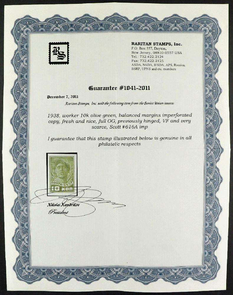 | Zusatzinformationen und Suchstichworte: | Cheshire Stamp Auction - #8347 - Public Auction 14. - 15. Juli 2023 Los 928 Sowjetunion Russland 1937-56 10k oliv endgültige ohne Wasserzeichen ungezähnt (Scott 616Ab, Michel ein 676 I ein U, SG 727g var), Pracht ungebraucht, frisch & selten, mit Raritan Foto-Zertifikat. (Schätzpreis - niedrig: 100. hoch: 120) Ausruf 80,00 GBP |