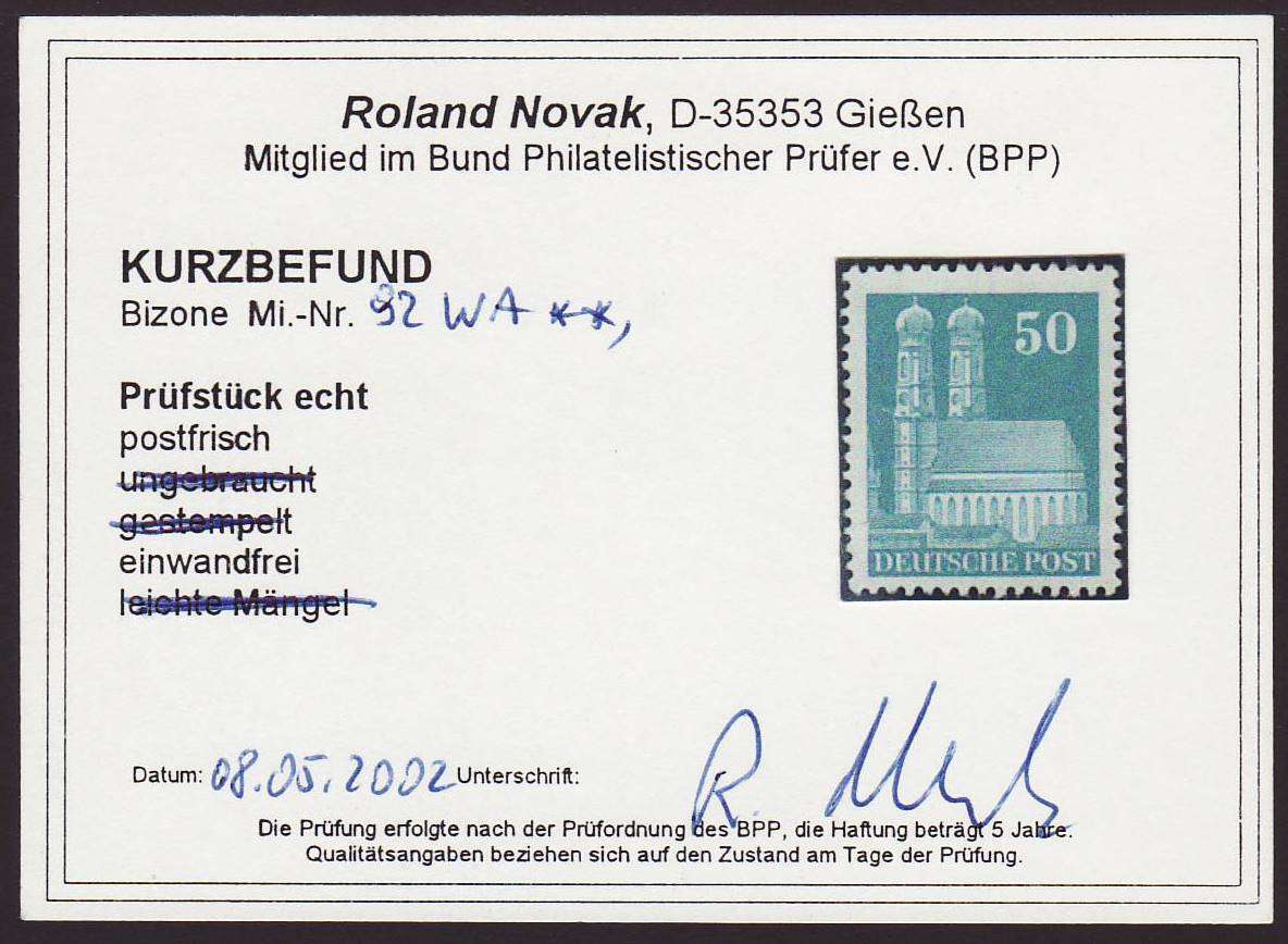 | Zusatzinformationen und Suchstichworte: | Christian E. Geigle Briefmarkenfachhandel Los 0004046609 Bizone 1948, Bauten, 50 Pf. grünblau, Wasserzeichen W, Zähnung A, postfrisches Kabinettstück, unsigniert mit FKB Novak "einwandfrei" Festpreis 99,00 EUR |