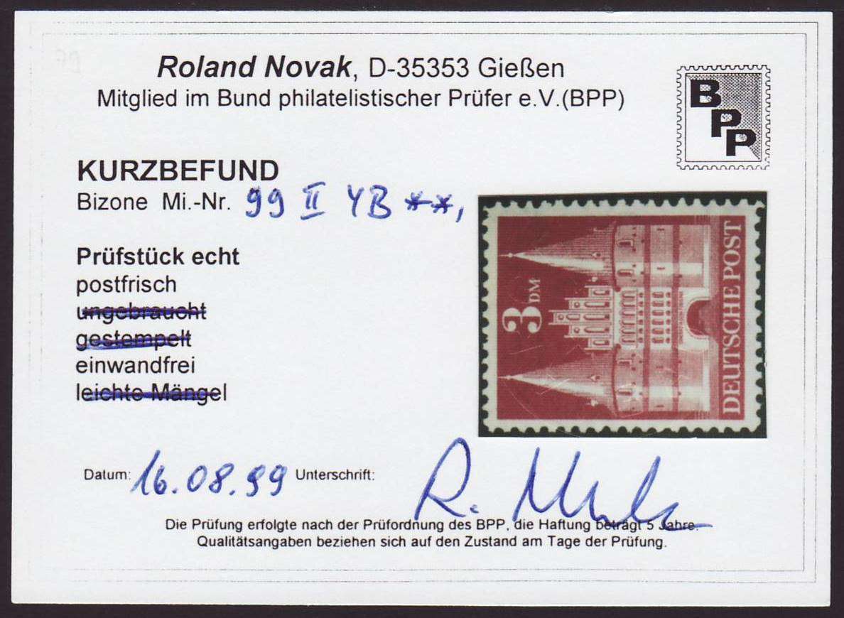 | Zusatzinformationen und Suchstichworte: | Christian E. Geigle Briefmarkenfachhandel Los 0003643372 Bizone 1948, Bauten, 3 M. dunkelrotlila, Type II, Wasserzeichen Y, Zähnung B, postfrisches Luxusstück, unsigniert mit FKB Novak "einwandfrei" Festpreis 110,00 EUR |