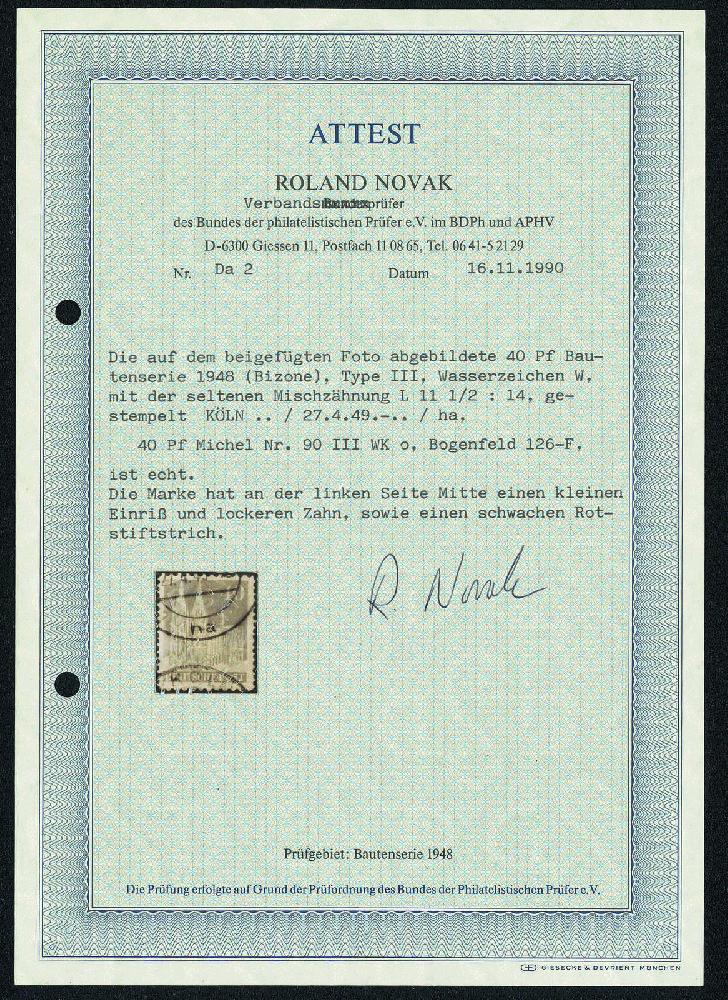 | Zusatzinformationen und Suchstichworte: | Gert Müller 119. Auktion 24. - 26. August 2023 Los 5736 Bizone 40 Pfg. Bauten, Type III, Wasserzeichen W, seltene Mischzähnung L11 1/2:14, kleine Beanstandungen, sauber gest. "KÖLN 27.4.49.", Fotoattest Novak BPP Ausruf 150,00 EUR |