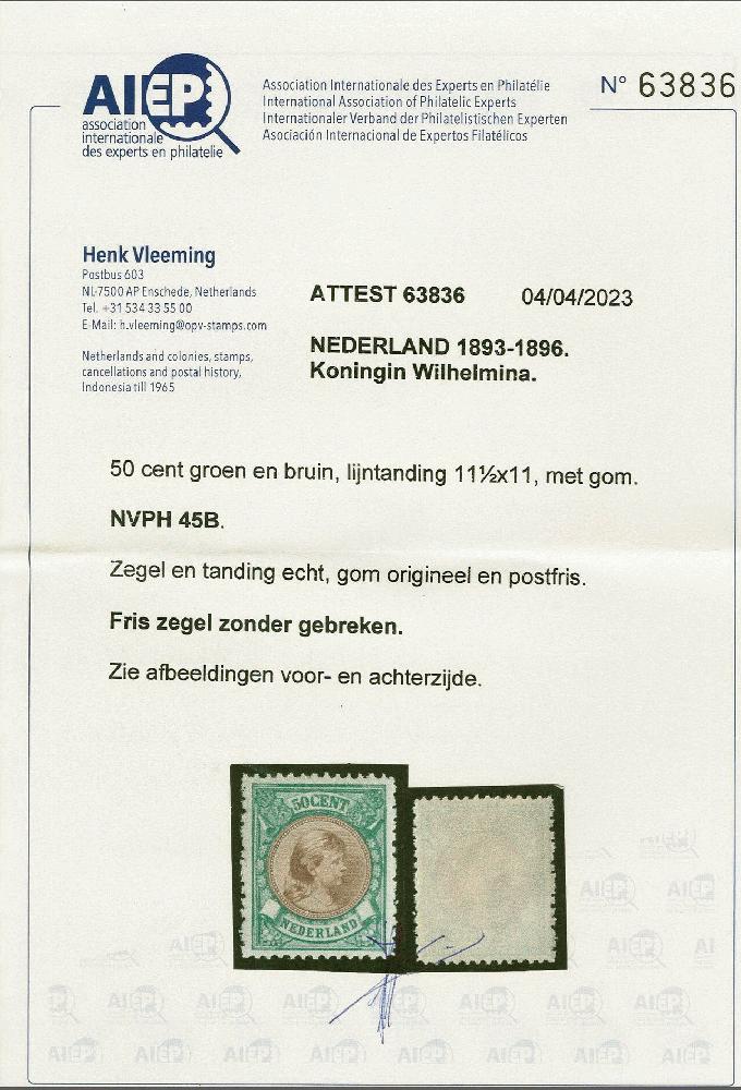 | Zusatzinformationen und Suchstichworte: | Corinphila Veilingen 257. Auktion 13. - 16. September 2023 Los 4379 Niederlande 50 cent groen en bruin tanding 11½ x 11 met certificaten Muis 2005 (fotocopie) en Vleeming 2023, cat.w. 900 Ausruf 200,00 EUR |
