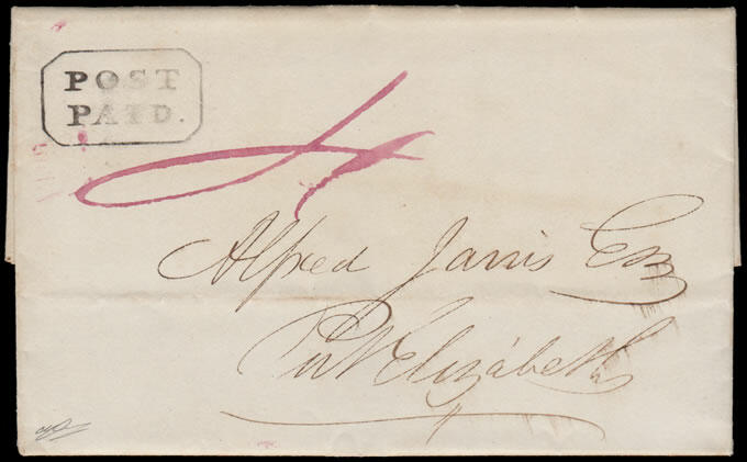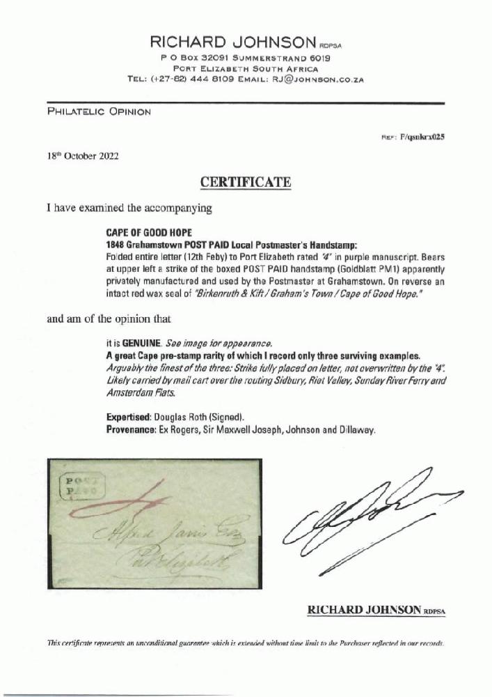 | Zusatzinformationen und Suchstichworte: | Filat AG Shop Neu Los 5167 (D) Kap der Guten Hoffnung 1848 GRAHAMSTOWN POSTMASTER'S LOCAL HANDSTAMP: Charming folded entire (12th Feby) to Port Elizabeth attractively rated "4" in purple manuscript. Bears at top left a superb strike of the boxed POST PAID handstamp (Goldblatt PM1) apparently privately manufactured/used by the postmaster at Grahamstown. On reverse intact red wax seal of "Birkenruth & Kift / Graham's Town / Cape of Good Hope." A great rarity, an exhibition piece for connoisseur! Festpreis 9.850,00 CHF |
