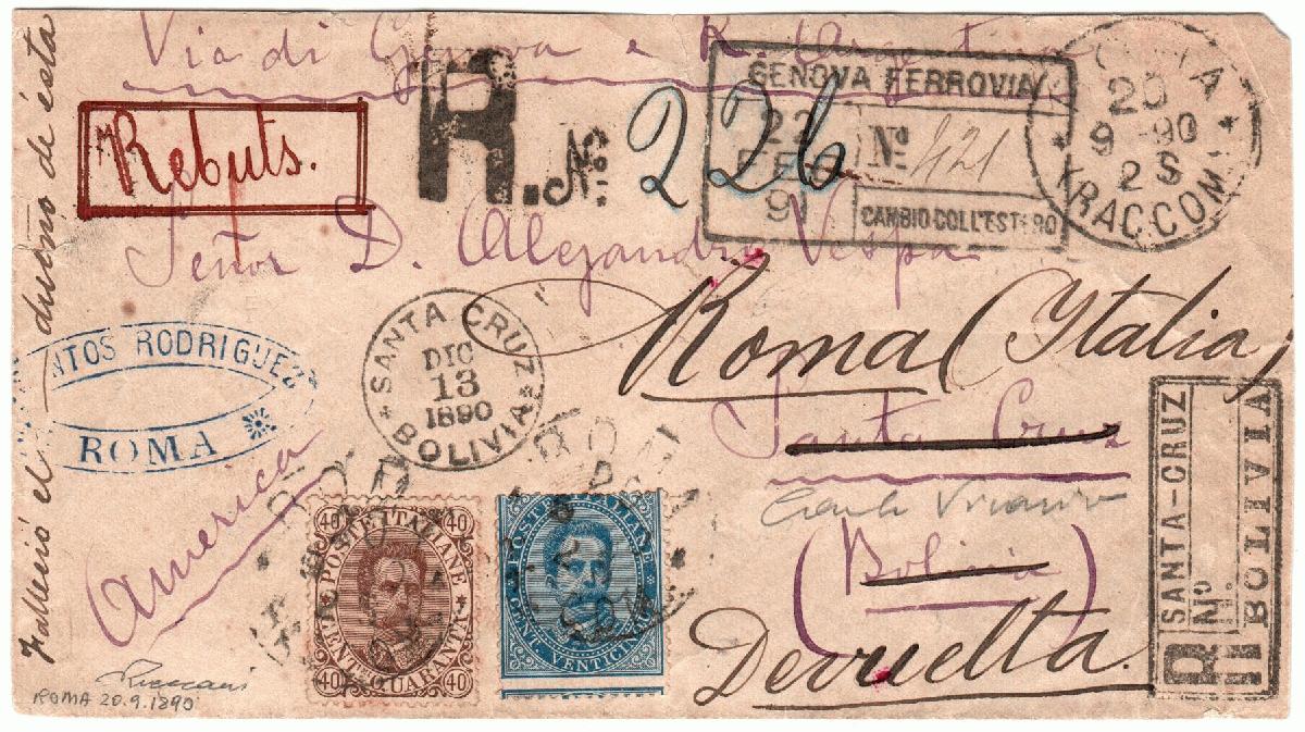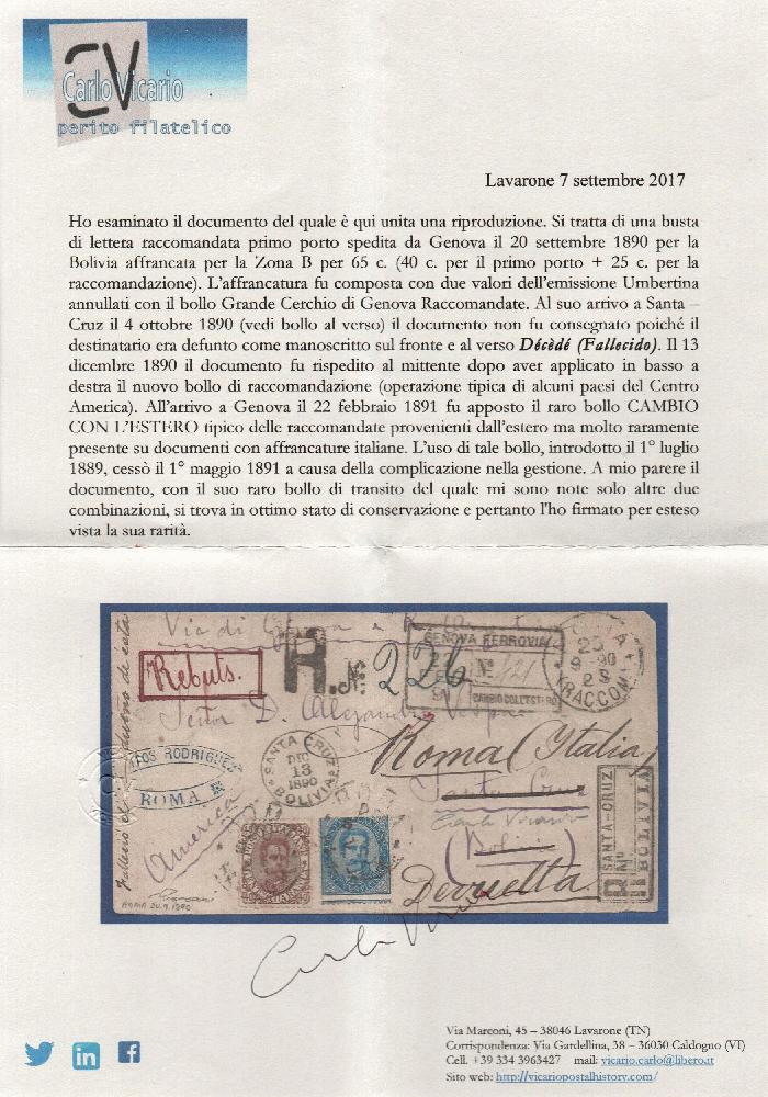 | Zusatzinformationen und Suchstichworte: | Filatelia Sammarinese Saalauktion 8. - 9. September 2023 Los 1580 Bolivien Bolivia - racc. da Roma 20 SET 90 a S.ta Cruz (Bolivia) con 25 + 40 c. (40+45). Poichè il destinatario risultò deceduto, la lettera fu ritornata al mittene e presa in carico dall'Ufficio di cambio GENOVA FERROVIA IL 22 FEB 91. Rara. Vaccari, cert. Vicario Ausruf 350,00 EUR |