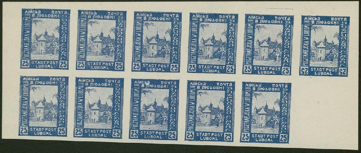 | Zusatzinformationen und Suchstichworte: | Ulrich Felzmann 37. e@uction 5. - 8. September 2023 Los 11570 Polen Lokalausgabe Luboml LUBOML, 5-50 H Stadtansichten ungezähnt, alle fünf Werte je im kompletten Kleinbogen zu 11 Marken und einem Leerfeld sowie je einem Exemplar mit kopfstehender Wertangabe, alle einwandfrei postfrisch, teils mit herstellungsbedingt üblichen Kalanderbügen, Pracht, Fotoattest Korszen Ausruf 200,00 EUR |