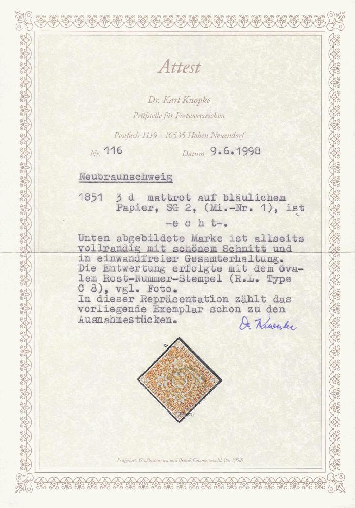 | Zusatzinformationen und Suchstichworte: | 154. & 155. Teutoburger Münzauktion 24. Februar - 2. März 2023 Los 1030 Neubraunschweig 3 P. Krone und heraldische Blumen 1851, mattrot auf bläulichem Papier, allseits vollrandig mit schönem Schnitt und in einwandfreier Gesamterhaltung. Die Entwertung erfolgte mit dem ovalen Rost-Nrn-Stempel. In dieser Erhaltung zählt das vorliegende Exemplar schon zu den Ausnahmestücken. Fotoattest Dr. Knopke. gestempelt Zuschlag 320,00 EUR |