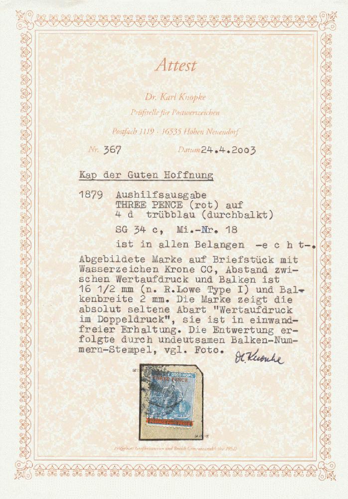 | Zusatzinformationen und Suchstichworte: | 19. classicphil GmbH Auktion 12. - 13. September 2023 Los 1876 Kap der Guten Hoffnung 1879,3d auf 4d, blau, rot drei PENCE und Balken, drei PENCE mit Doppeldruck, auf Briefstück, gebraucht, Wasserzeichen CC, tadellose Erhaltung von dieser außergewöhnlich Rarität, Attest Knopke, CV £4500, Kabinett! Schätzpreis 5,400 EUR Ausruf 1.200,00 EUR |