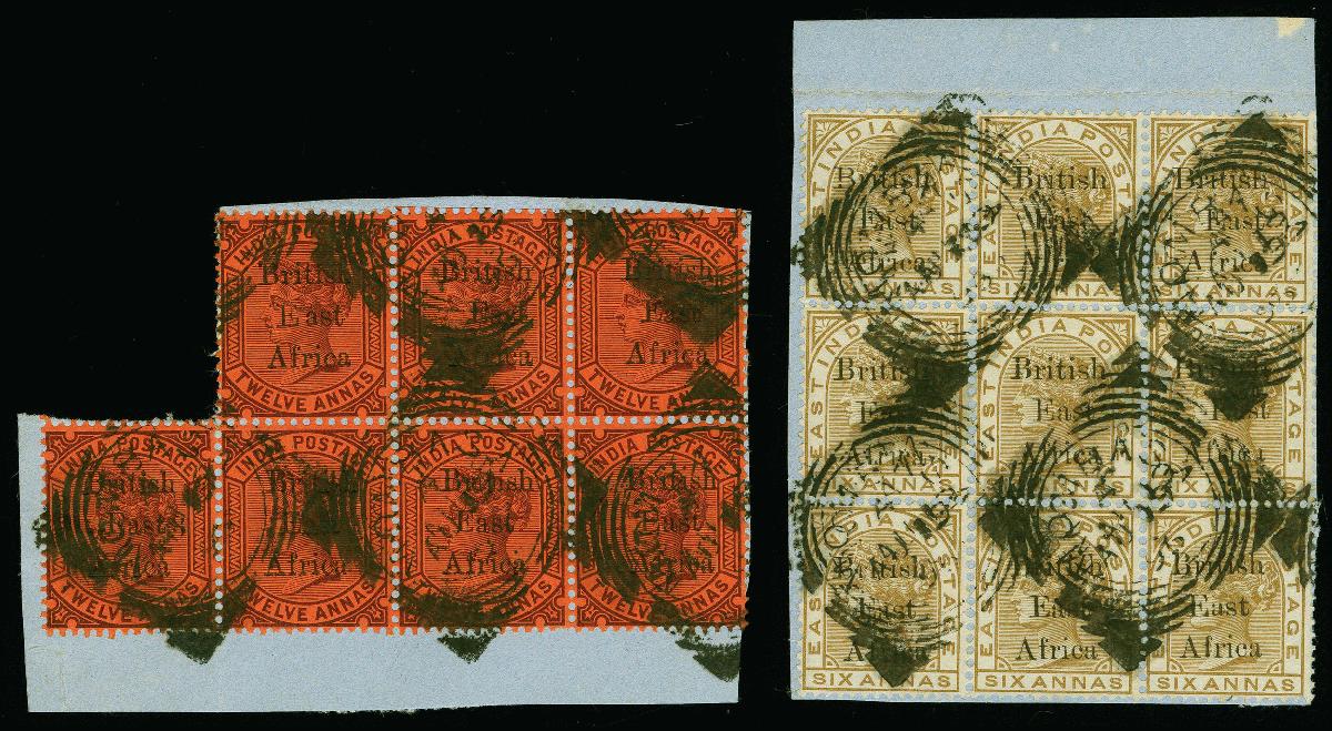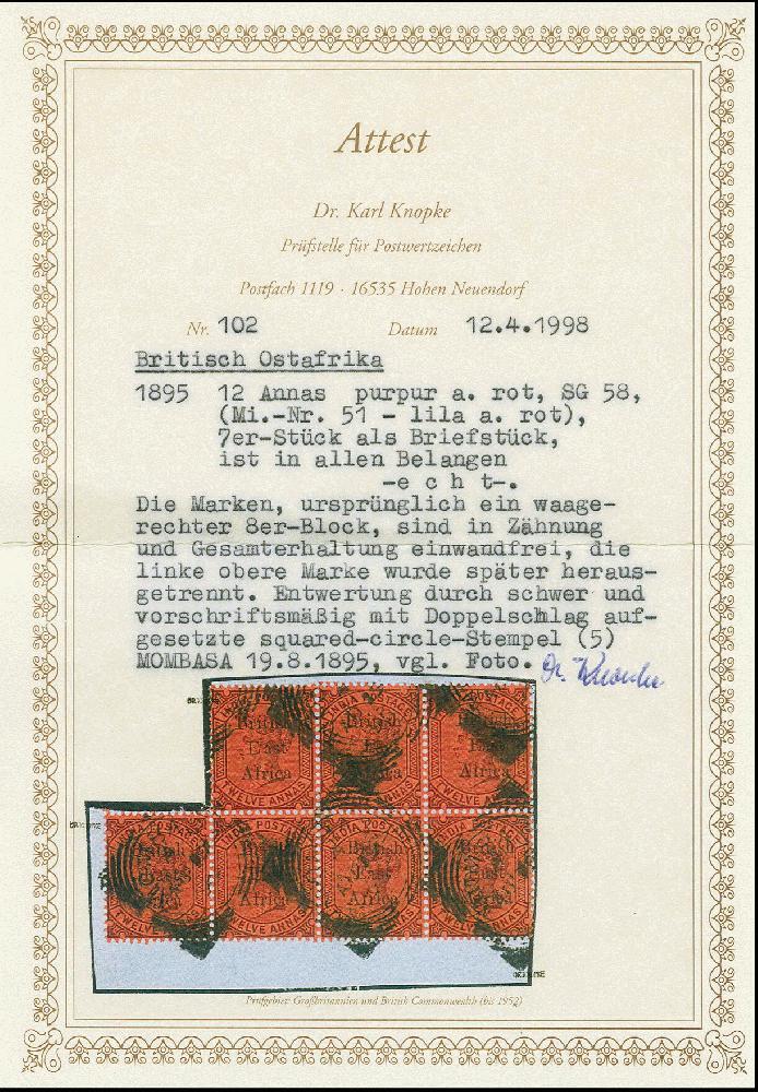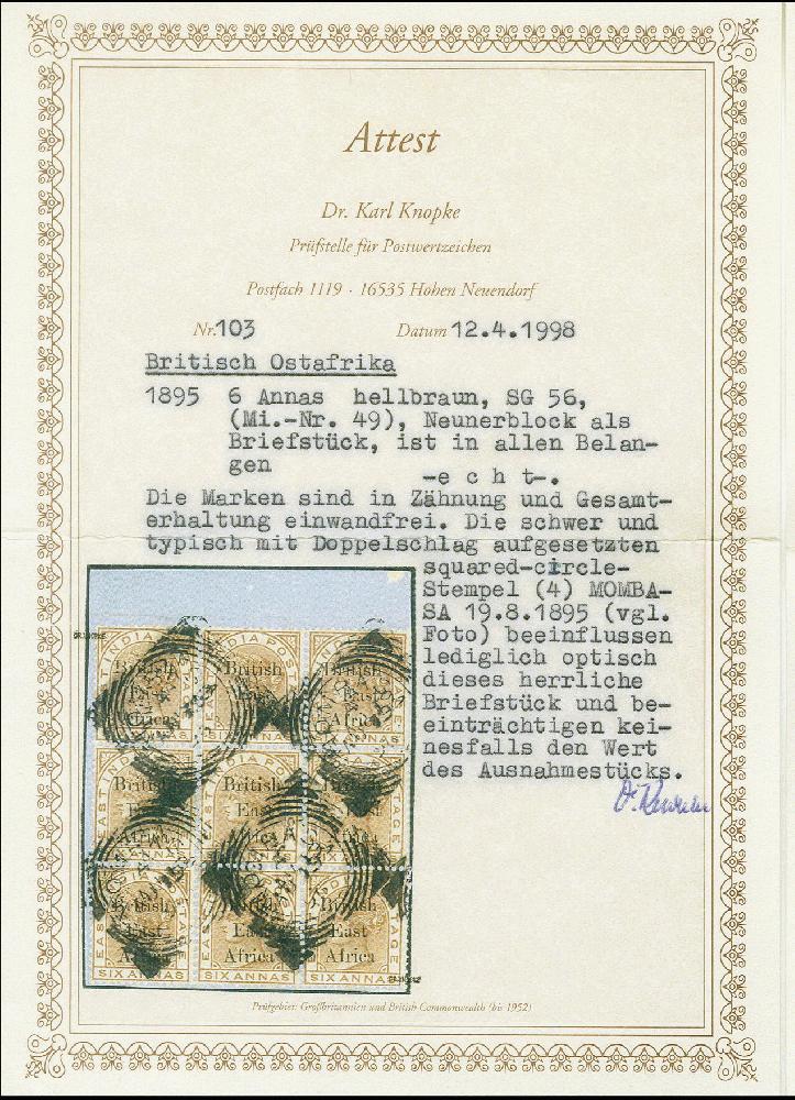 | Zusatzinformationen und Suchstichworte: | Heinrich Köhler 382. Auktion 18. - 23. September 2023 Los 1751 Britisch Ostafrika und Uganda 1895/96, overprint issue 6 a. in block of nine and 12 a. in block of seven, each tied by squared circle of Mombasa to piece, fine/very fine, each with certificate Dr. Knopke Ausruf 150,00 EUR |