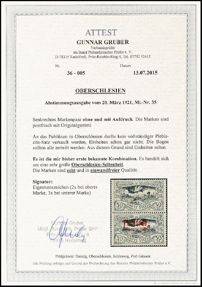 | Zusatzinformationen und Suchstichworte: | Mi-Nr. 36 Paar mit und ohne Aufdruck; Tippfehler im Attest (Mi-Nr. 35 anstelle 36) Auktionshaus Dr. Reinhard Fischer, 145. Auktion (04.09.-05.09.2015), Los 8676, Ausruf 500,00 Euro, Zuschlag 800,00 Euro. Quelle: https://auktion.reinhardfischerauktionen.de/de/catalog/lot/762320 |