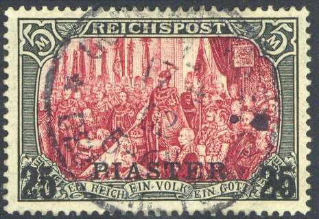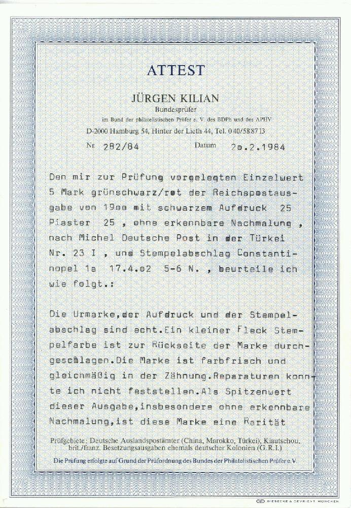 | Zusatzinformationen und Suchstichworte: | Veuskens 121. Auktion 10. - 11. August 2023 Los 1419 Deutsche Auslandspost Türkei 25 Pia. auf 5 Mark Germania REICHSPOST 1900, in Type I. (ohne Nachmalungen), zentr. gest. 'Constantinopel 17.4.02', gepr. Bothe und Kilian BPP sowie ausführl. Farbfotoattest Kilian 'Aufdruck und Stpl. sind echt, ein kl. Fleck (Stpl.-Farbe) ist zur Rückseite der Marke durchgeschlagen. Die Marke ist farbfrisch und gleichmäßig gezähnt', Bedarfsstück der seltenen Type I. M€ 1.700,-- Zuschlag 340,00 EUR |