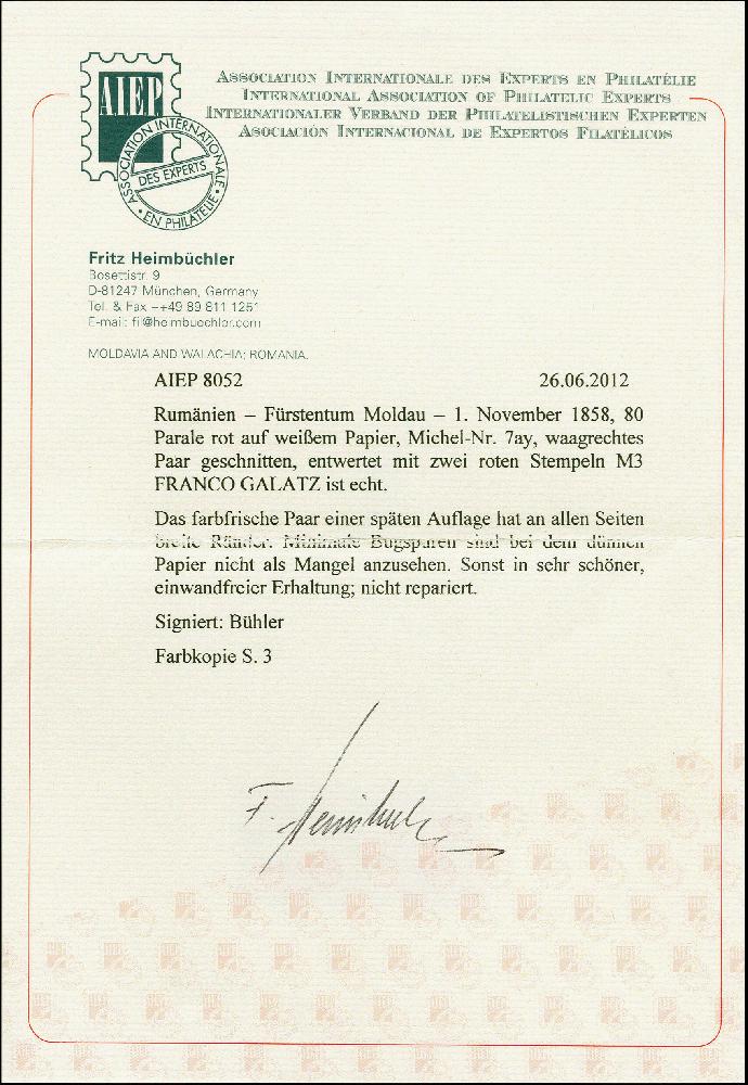 | Zusatzinformationen und Suchstichworte: | Heinrich Köhler 382. Auktion 18. - 23. September 2023 Los 1320 Rumänien 80 par. red, horizontal pair with good colour and wide margins all around, used with "FRANCO GALATZ", very fine, certificate Heimbüchler AIEP Ausruf 300,00 EUR |