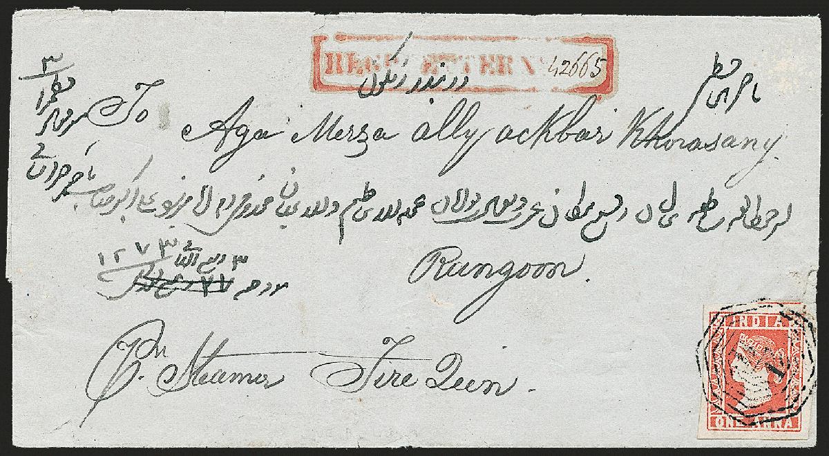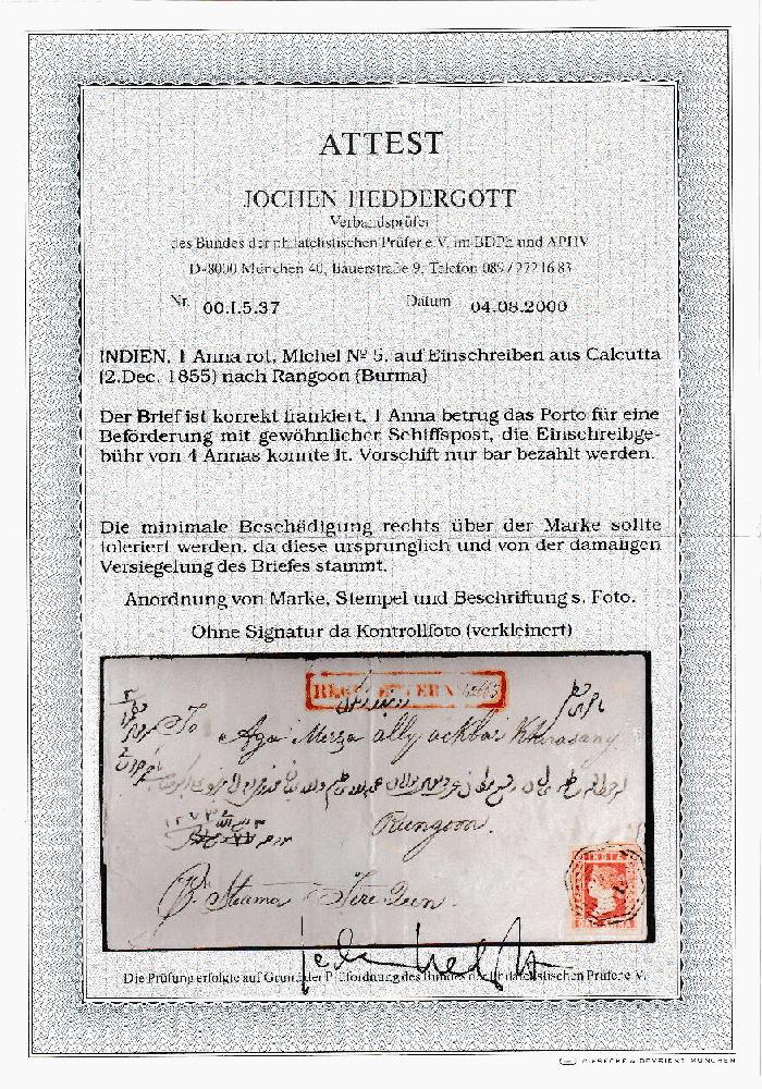 | Zusatzinformationen und Suchstichworte: | Robert A. Siegel - The Magnolia Collection: India Postal History & Stamps Used Abroad 11. Mai 2023 Los 107 Indien 1854,1a mattrot, Platte II (4B; SG 14). Riesige Ränder inklusive Spur einer angrenzenden Marke oben, kleine Kerbe oben rechts im Rand, entwertet mit "B/1" Stempel auf eingeschriebenem Faltbriefhülle zu Rangoon, Burma, Kalkutta Dec. 2,1855 Abfertigung auf Rückseite, rot "eingeschrieben. Brief nein. "Rechteckhandstempel mit handschriftlich Registratur Nummer, hell Randbeanspruchung, Pracht und selten Einschreiben Anwendung zu Burma, 1a entrichtet die Briefporto mit 4a Registratur Gebühr in bar bezahlt, ex Dr. Kornan, mit 2000 Heddergott Attest Ausruf 750,00 USD |