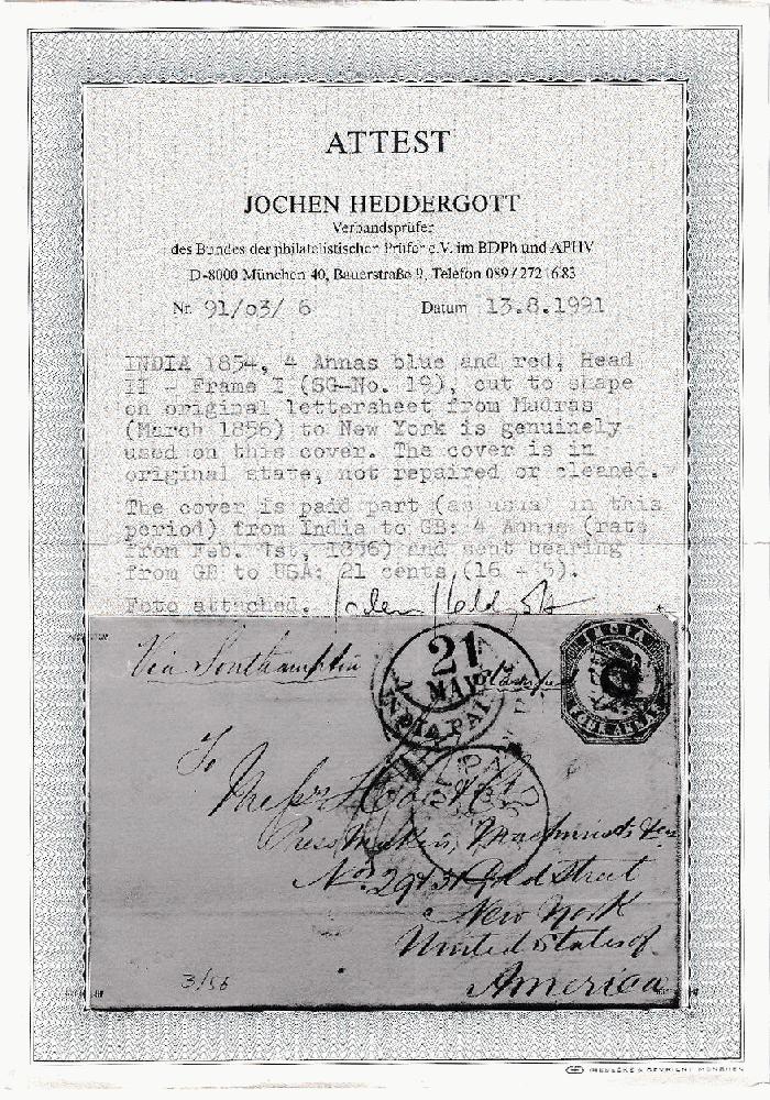 | Zusatzinformationen und Suchstichworte: | Robert A. Siegel - The Magnolia Collection: India Postal History & Stamps Used Abroad 11. Mai 2023 Los 134 Indien 1854,4a rot und blau, zweite Auflage, Kopf Platte II, Rahmen Die I (6D; SG 19). Auf Form geschnitten, gerandet bis berührt, handschriftliche Entwertung "abgestempelt" und leichter Abschlag von "C/1" punktierter Diamant Stempel mit zartem Abschlag rot Madras März 1856 Kasten Abfertigung auf Faltbrief nach New York Stadt, Vereinigte Staaten, Absenderanweisung "über Southampton", rot "Indien gezahlt" Halbmond, London Transit und "N. York bin. Pkt. Mai (Datum) "c belasten Datumsstempel Pracht und seltene Verwendung der 4-ANNAS Lithographie vom zweite Auflage auf Brief in die Vereinigten Staaten. Sehr wenige 4-ANNAS Briefe bekannt hierzu Bestimmungsort. Umschlägen in die Vereinigten Staaten mit die Lithographie Briefmarken sind sehr selten. Wir schätzen ungefähr ein Dutzend Umschlägen existieren. Der Absender hatte Kabinett ob abschicken Briefpost in Richtung Westen über Marseilles oder Southampton, oder in Richtung Osten über privat Schiffe entlang die Pazifik. Als meiste Briefpost ist gerichtet an den östliche seaboard, die in Richtung Westen Strecke war die häufigeren ausgewählt. Mit 1991 Heddergott Attest Ausruf 3.000,00 USD |