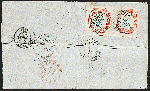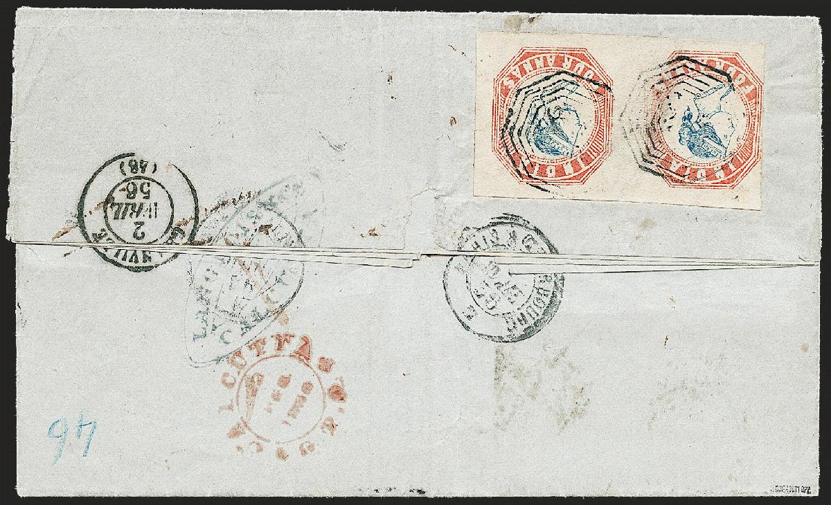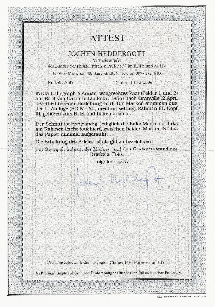 | Zusatzinformationen und Suchstichworte: | Robert A. Siegel - The Magnolia Collection: India Postal History & Stamps Used Abroad 11. Mai 2023 Los 166 Indien 1854,4a rosarot und blau, fünfter Druck, Kopf Die III, Rahmen Platte II (6G; SG 25). Waagrechtes Paar, meist überrandig bis berührt auf der linken Seite, gestempelt mit zwei Abschlägen von "B/1" Stempel mit rotem Kalkutta Feb. 22,1856 Kreisdatumsstempel auf Rückseite von Faltbrief nach Granville, Frankreich, Absenderanweisung "per Bentwick über Marseilles", rot "Indien gezahlt" Handstempel, Transit und Granville Ankunft rückseitige Stempel, Paar mit etwas leicht abreibend zumeist zwischen den Marken im Rand fein und selten 4-ANNAS fünfte Auflage Lithographie Paar auf Brief nach Frankreich. SG 25 Paar Katalogwert £5,500 lose. Mit 2006 Heddergott Attest Ausruf 2.000,00 USD |