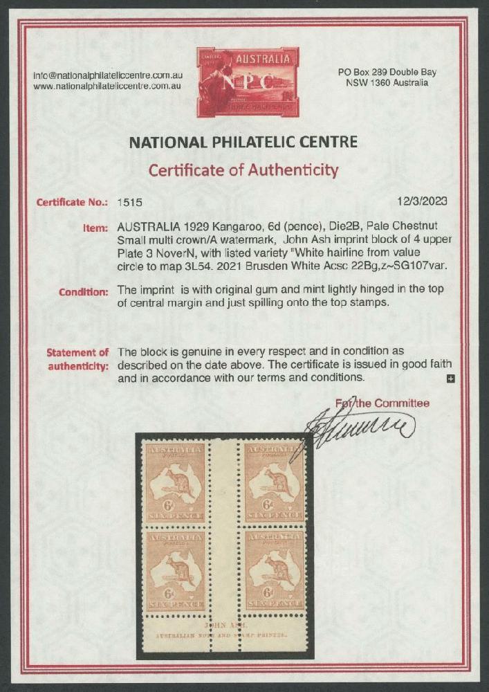 | Zusatzinformationen und Suchstichworte: | 253. Abacus Auktion 19. - 22. September 2023 Los 1105 Australien - Känguruhs - c 6d braun Platte 3 John Ash Eindruck Viererblock Mittau ab Nullabor zu Wertkreis ACSC 22 (3), die untere Einheiten sind postfrisch, Katalogwert $450 +, für montiert. NPC Attest (2023) Ausruf 135,00 AUD |