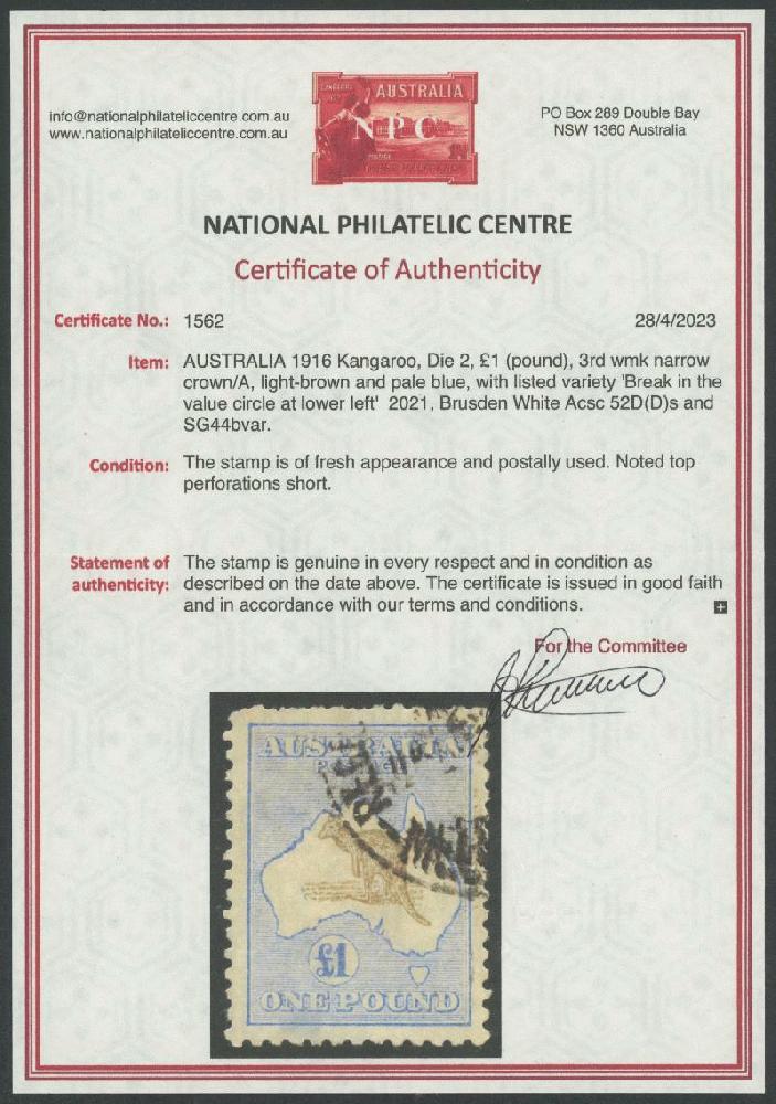 | Zusatzinformationen und Suchstichworte: | 253. Abacus Auktion 19. - 22. September 2023 Los 1098 Australien - Känguruhs - drittes Wasserzeichen £1 braun und blau mit zerbrechen zu Lower-Left von Value-Circle ACSC 52 (D) s, sehr gut zentriert, kurze Zähne oben, Melbourne Kreisdatumsstempel gut nicht auf der Abart, Katalogwert $3500. NPC Attest (2023) Ausruf 380,00 AUS |