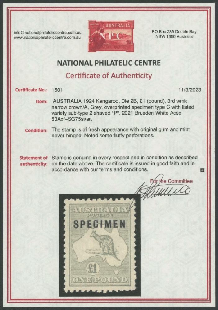 | Zusatzinformationen und Suchstichworte: | 253. Abacus Auktion 19. - 22. September 2023 Los 1101 Australien - Känguruhs - drittes Wasserzeichen £1 grau mit Type C Specimen-Aufdruck mit rasiert P ACSC 53xf, ausgezeichnet zentriert, einige unregelmässig Zähne, postfrisch, Katalogwert $1000, für montiert. NPC Attest (2023) Ausruf 230,00 AUD |