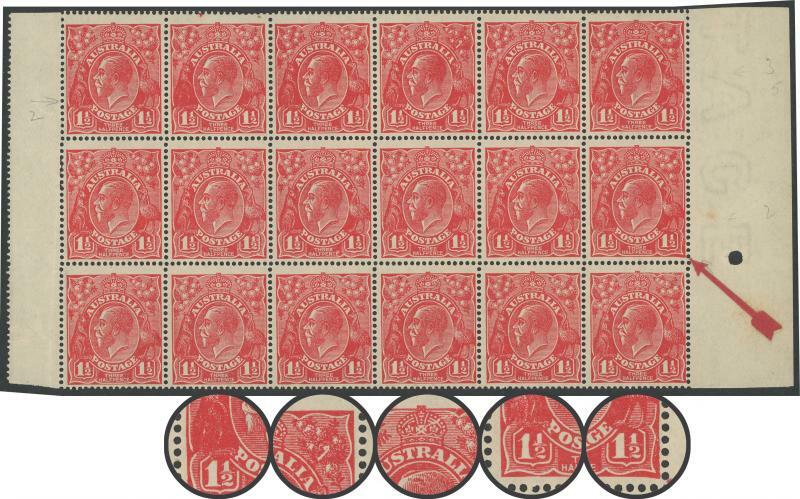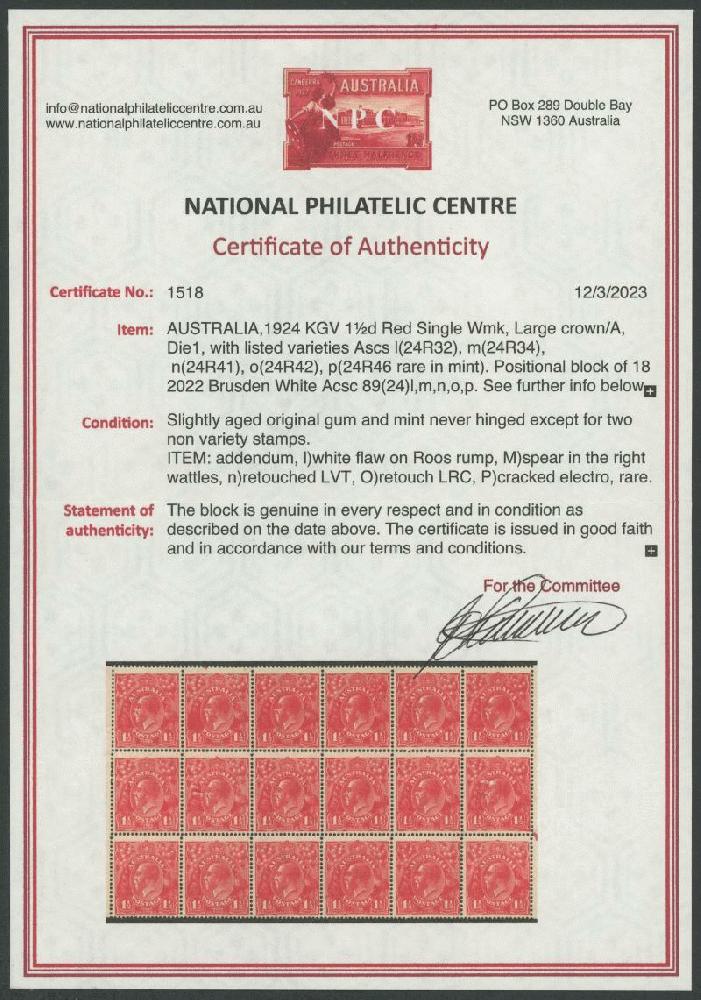 | Zusatzinformationen und Suchstichworte: | 253. Abacus Auktion 19. - 22. September 2023 Los 1140 Australien - KGV - Single Watermark 1½d purpurrot Elektro 24 Block von 18 (6x 3) vom rechte Schalterbogen mit gelistet Abarten retuschiert Fehler auf Känguruhs Hinterbacken, Spieß in rechte Wattles usw, retuschiert 1½ zu Lower-Right, schwerem Retuschen zu L/L Ecke und rissig Elektro ab Rückenzarge hinein Krone ACSC 89 (24) la ungebraucht n o und p, der Gummi etwas gealtert mit ein paar tonespots aber meiste Einheiten sind postfrisch, Katalogwert $1200 + +, für montiert Einzelmarken. Ausgezeichnet Feld. NPC Attest (2023) Noten jenes die rissig Elektro ist "selten in ungebraucht" (dasselbe) Ausruf 380,00 AUD |