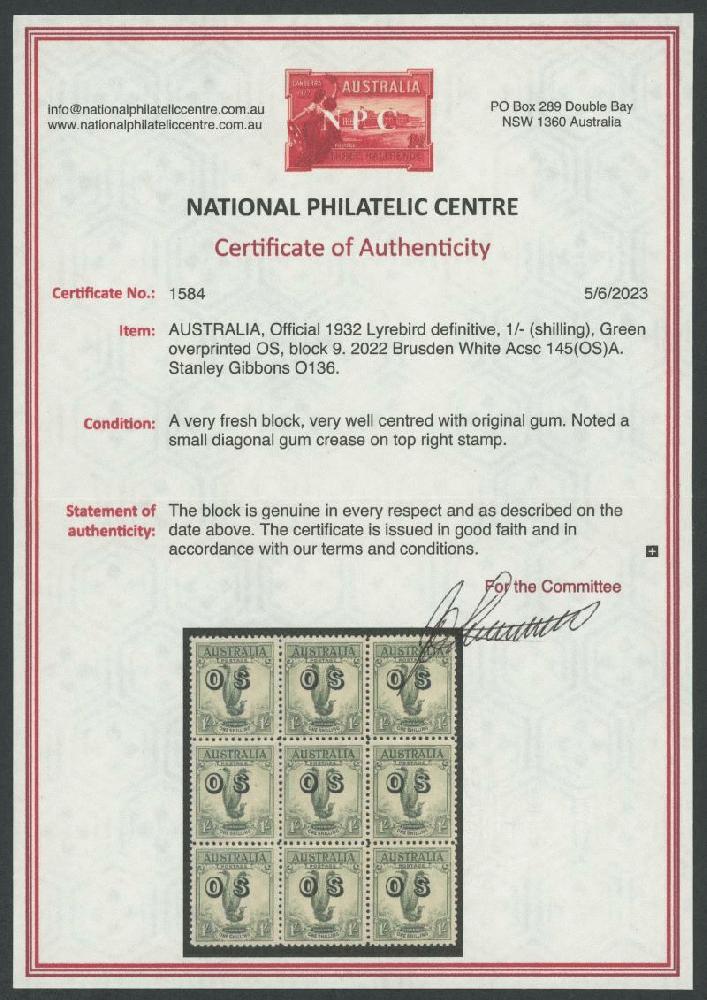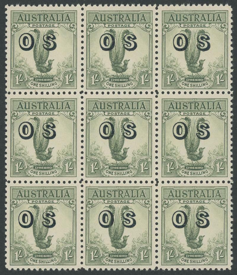 | Zusatzinformationen und Suchstichworte: | 253. Abacus Auktion 19. - 22. September 2023 Los 1151 Australien - andere Vor-Dezimalzeit 1932 große Lyrebird 1/- grün überdruckt OS ACSC 145OS (SG O136) Block von 9, sehr gut zentriert, einige charakteristisch kleinere gum-bends ansonsten Pracht postfrisch, Katalogwert $1350 + (£495 + +, für montiert), für Einzelmarken. Ein wunderschön und seltene Einheit. NPC Attest (2023). (ein EckrandBlock von 9 der nicht überdruckten Briefmarke verkauft zu unser Versteigerung von 6,12,2003 für $1495) Ausruf 575,00 AUD |