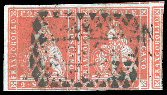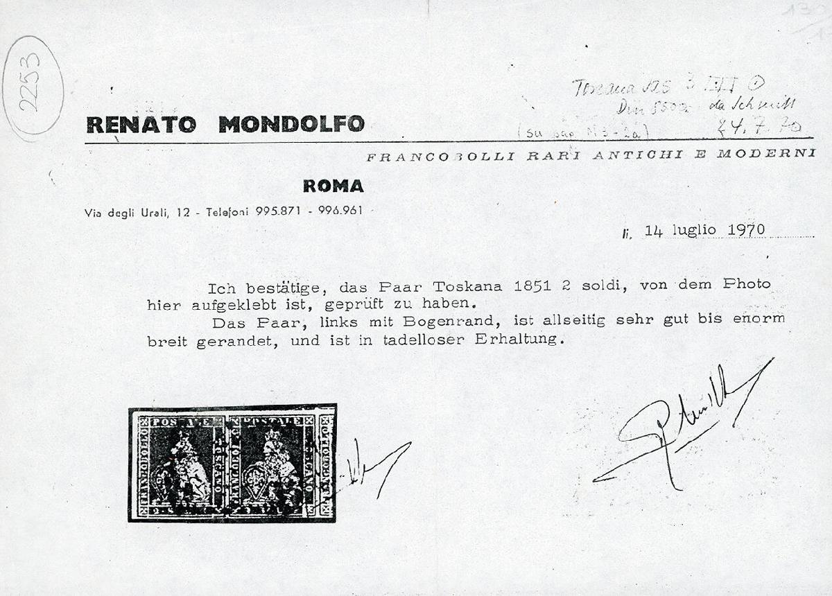 | Zusatzinformationen und Suchstichworte: | Ferrario 30. Auktion 26. September 2023 Los 800 Italien Staaten Toscana 1851 - 2 soldi scarlatto su azzurro (3), coppia orizzontale, perfetta, tre margini eccezionali, con parte dei vicini, usata. Rara e di splendida qualità. Fotocopia cert. Mondolfo. Cat. € 35000. (Stima: € 4000) Ausruf 4.000,00 EUR |