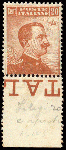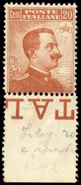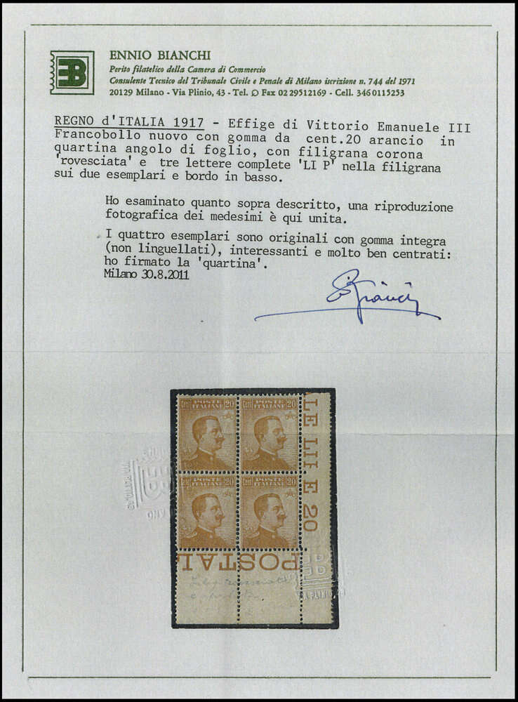 | Zusatzinformationen und Suchstichworte: | DBA Freiburg GmbH Los 1720011714 Italien 1917, 20 C. Freimarke König Viktor postfrisch mit kopfstehendem Wasserzeichen, Farbkopie des Farbfotoattestes Bianchi/Mailand eines ehemaligen 4-er Blocks beiliegend. Im Michel 2020 nicht notiert! Festpreis 60,00 EUR |
