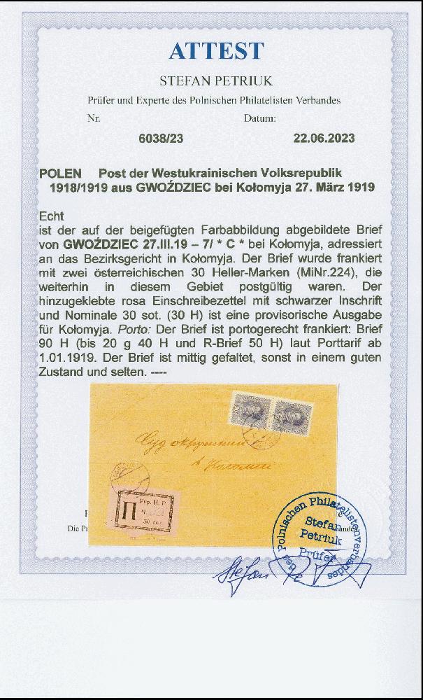 | Zusatzinformationen und Suchstichworte: | Heinrich Köhler 382. Auktion 18. - 23. September 2023 Los 1612 Westukraine 1918, registration stamp, position 1 and Austria Karl I. 30 pfg. as vertical pair tied by cds. "GWOZDZIEC 27 III.19" to cover to Kolomea, vertical fold not affecting adhesives, fine and rare, signed Bulat and certificate Petriuk (2023) Ausruf 800,00 EUR |