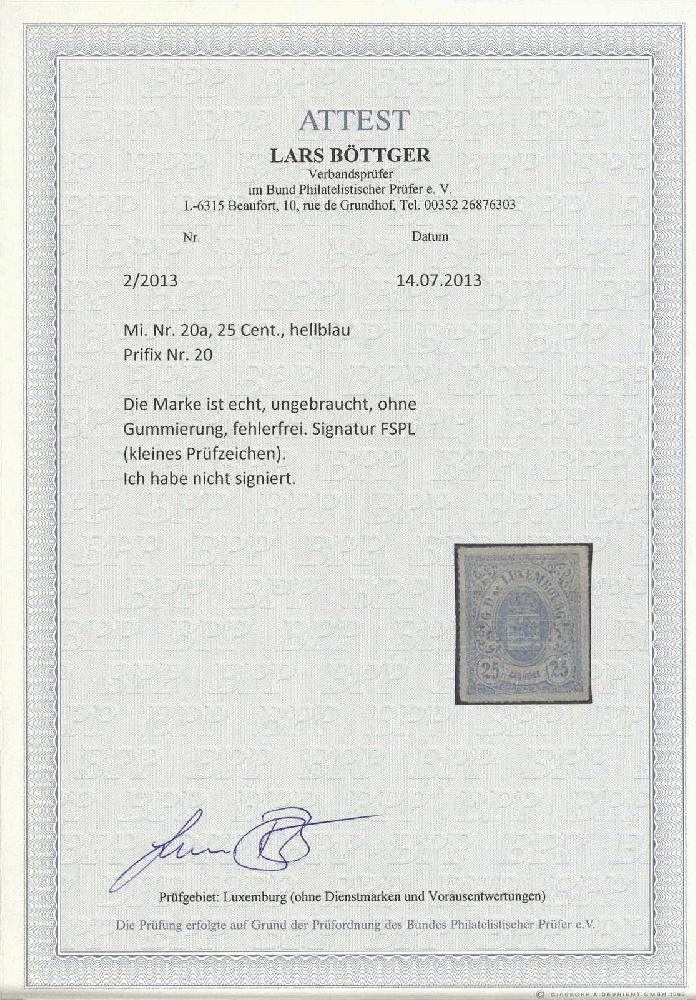 | Zusatzinformationen und Suchstichworte: | Gert Müller 119. Auktion 24. - 26. August 2023 Los 3405 Luxemburg 25 C. Wappen hellblau, herrlich farbfrisch und perfekt durchstochen, wie üblich o.G. in fehlerfreier Erhaltung. Eine sehr seltene Marke! Fotoattest "FEHLERFREI" Böttger BPP. Mi. für ohne Gummi 1400,- € Ausruf 450,00 EUR |
