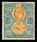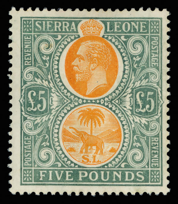 | Zusatzinformationen und Suchstichworte: | Kelleher 787. Auktion 6.-9. September 2023 Los 45 Sierra Leone 1912, König Georg V, £5 orange und grün (Scott 121), Einheit Krone CA Wasserzeichen, Originalgummi, postfrisch (!) ein ausgezeichneter ungebrauchte Einzelmarke mit frischem, kräftige Farben, zentriert gerade ein Farbton rechts, immer noch sehr schön. Ein herausragendes Stück dieser seltenen Edward VII hoher Wert, mit 1977 R. P. S. L. Attest. SG 130; £3,750 für gefalzt ($4,840). Scott $3,750 für gefalzt. Ausruf 1.750,00 USD |