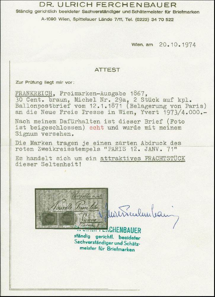 | Zusatzinformationen und Suchstichworte: | Heinrich Köhler 382. Auktion 18. - 23. September 2023 Los 1035 Frankreich LE GÉNÉRAL FAIDHERBE: Small entire letter franked with two single stamps Lauré 30 c. brown tied by red cds. "PARIS 12.JANV.71" to Vienna without arrival mark, light vertical folded, otherwise fine, certificate Dr. Ferchenbauer (1974) Ausruf 150,00 EUR |