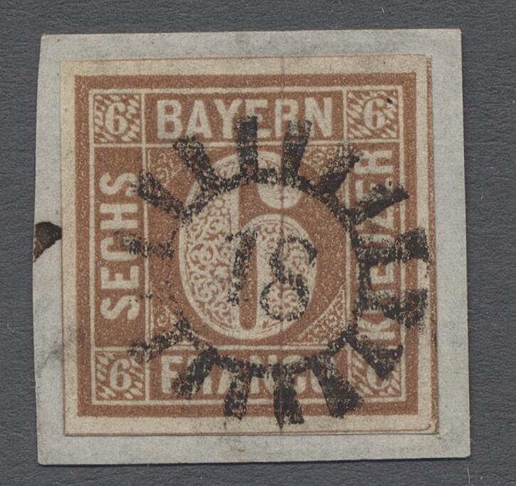 | Zusatzinformationen und Suchstichworte: | Auction Galleries Hamburg 29. Auktion 1. - 2. September 2023 Los 658 D Altdeutschland Bayern 1849, Freimarke 6 Kr. lebhaftrötlichbraun in Type I, allseits vollrandig geschnitten, mit sauberem geschlossenem Mühlradstempel "18" (Augsburg) entwertet und auf Briefstück. Laut Kurzbefund Sem BPP vom 2.1.2023 ist das Prüfstück echt und einwandfrei. Michel 300,- Euro Ausruf 80,00 EUR |