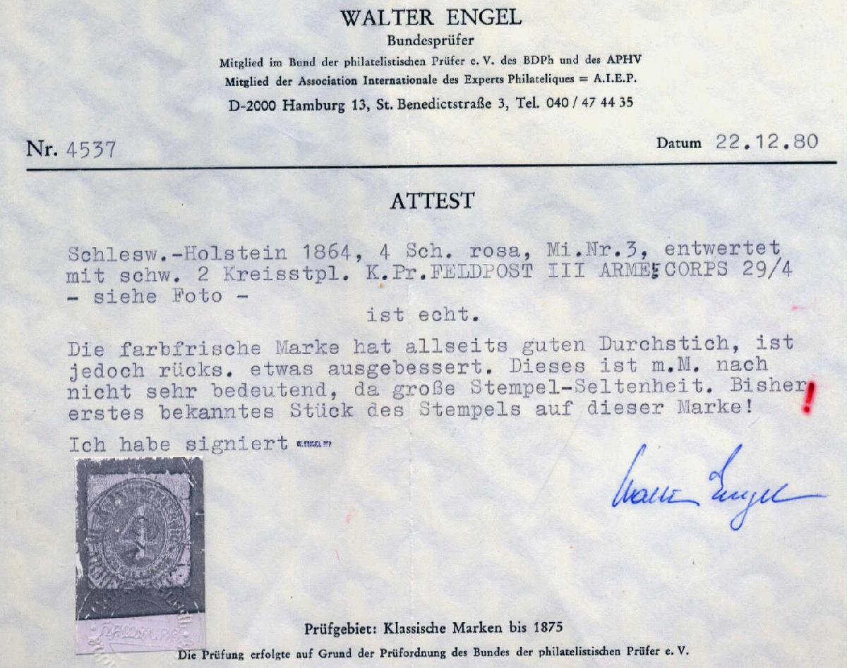| Zusatzinformationen und Suchstichworte: | AAK Phila GmbH 79. Auktion 14. - 16. September 2023 Los 2025 (D) Altdeutschland Schleswig Holstein "K.Pr.FELDPOST III ARMEE CORPS", seltener K2 a. 4 S karminrot, etw. erh. u. Attest W. Engel BPP "echt, farbfrisch, allseits guter Durchstich, rs. ausgebessert, große Stpl.-Seltenheit, bisher erstes bekanntes Stück auf dieser Marke!, RR Ausruf 150,00 EUR |