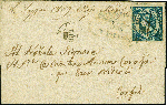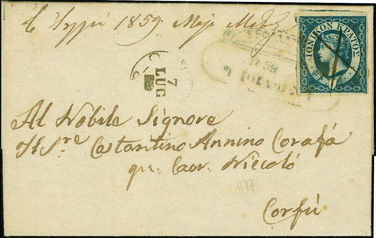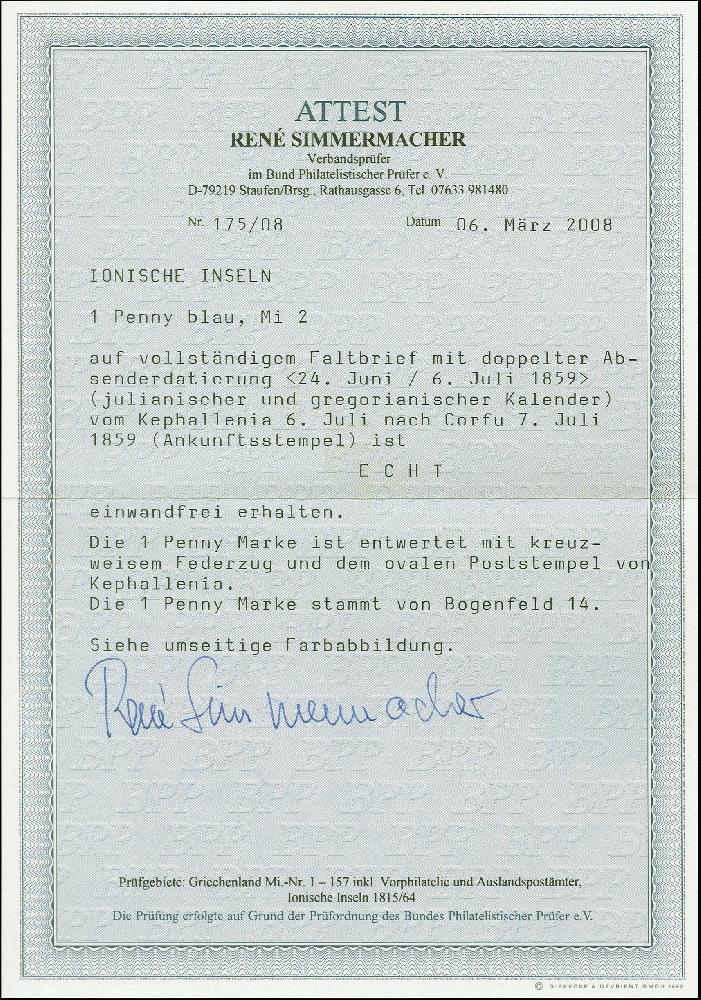 | Zusatzinformationen und Suchstichworte: | Heinrich Köhler 382. Auktion 18. - 23. September 2023 Los 1747 Ionische Inseln 1859, Queen Victoria 1 d. blue, position 14, fresh colours, good to large margins with parts of two adjoining stamps, pen crossed and tied by fancy cancel "KEFALONIA 1859 7 JULY" to entire letter to Corfu, arrival cds. "CORFU 7 JULY" alongside, a delightful early usage in appealing condition, certificate Simmermacher BPP (2008) Ausruf 500,00 EUR |