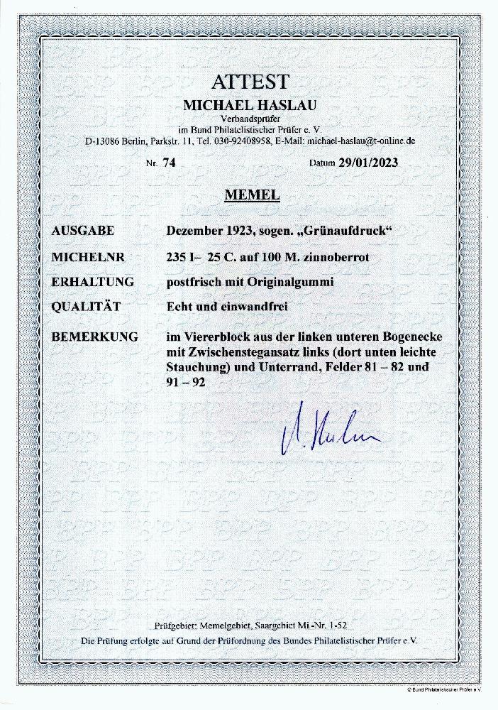 | Zusatzinformationen und Suchstichworte: | Georg Bühler 337. Auktion 8. - 9. September 2023 Los 3930 Memel Im Viererblock, Kab., Fotoattest Haslau (Katalogwert: 2800 Euro) Ausruf 600,00 EUR |