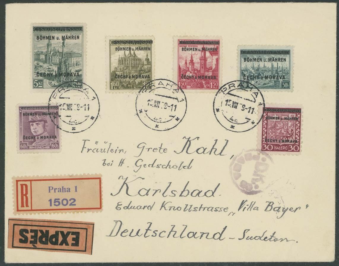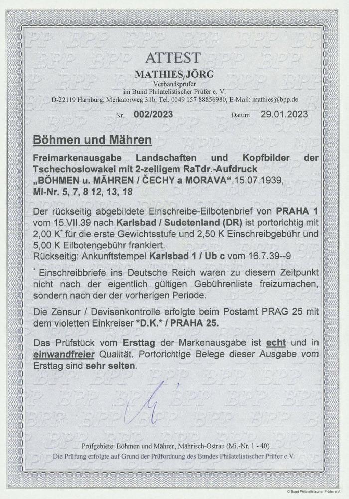 | Zusatzinformationen und Suchstichworte: | Ulrich Felzmann 37. e@uction 5. - 8. September 2023 Los 13051 Böhmen und Mähren 5 Kc nebst weiterer 5 Überdruckwerte in tarifrichtiger 9.50 Kc MiF mit Ersttagsstempel PRAHA 1 15.VII.39 auf R-Express-Brief nach Karlsbad in das Sudetenland in einwandfreier Prachterhaltung, vs. Zensur-K1 "D.K. PRAHA 25", rs. Ankunft 16.7.39, Fotoattest Mathies BPP "Portorichtige Belege dieser Ausgabe vom Ersttag sind sehr selten" Ausruf 120,00 EUR |
