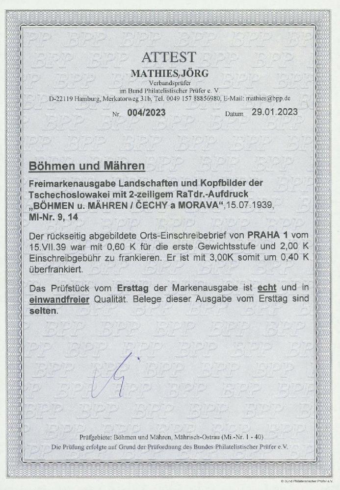 | Zusatzinformationen und Suchstichworte: | Ulrich Felzmann 37. e@uction 5. - 8. September 2023 Los 13048 Böhmen und Mähren 1 und 2 Kc mit Überdruck auf überfrankiertem Orts-Einschreiben mit Ersttagsstempel PRAHA 1 15.VII.39 in einwandfreier Prachterhaltung, Fotoattest Mathies BPP "... selten" Ausruf 40,00 EUR |