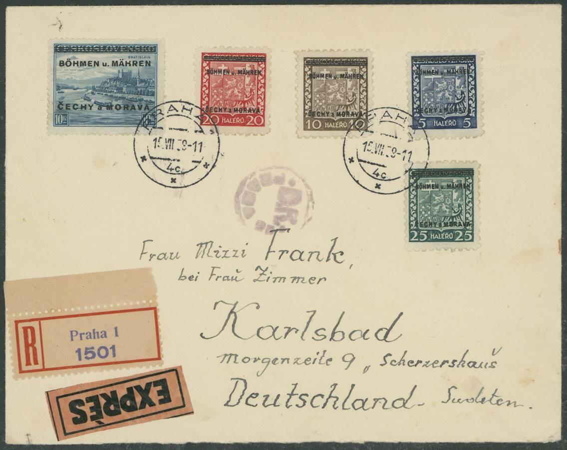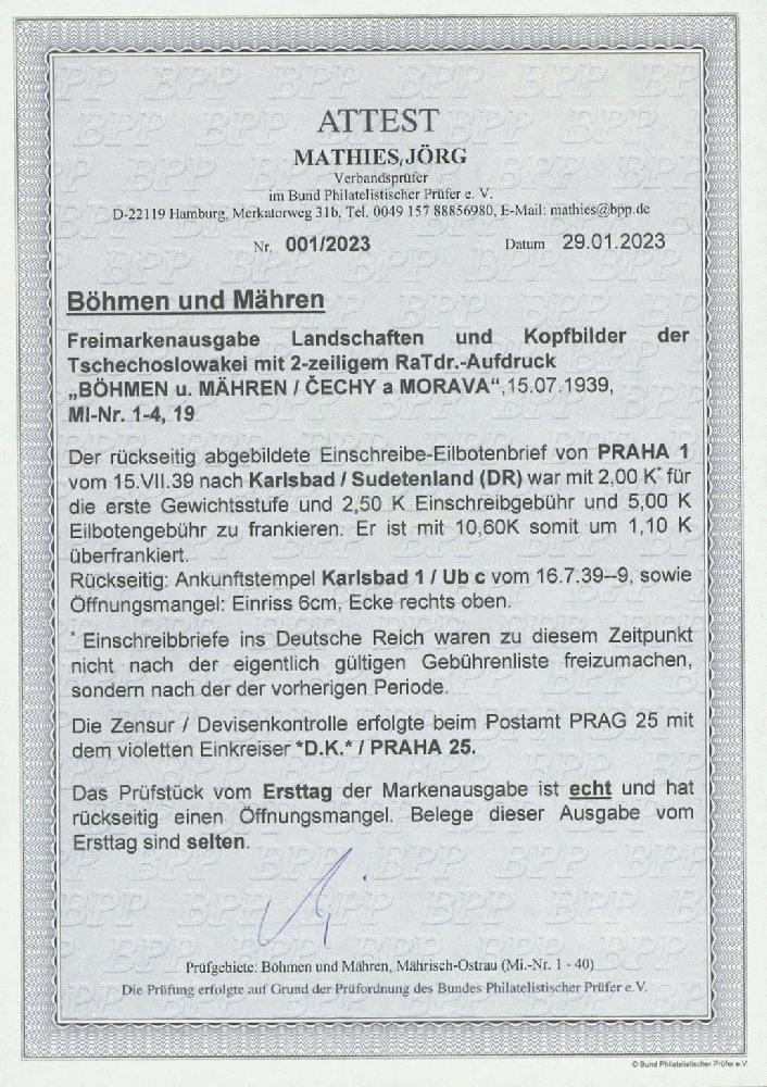 | Zusatzinformationen und Suchstichworte: | Ulrich Felzmann 37. e@uction 5. - 8. September 2023 Los 13052 Böhmen und Mähren 10 Kc Höchstwert mit weiteren 4 Überdruckwerten auf etwas überfrankiertem R-Express-Brief mit Ersttagsstempel PRAHA 1 15.VII.39, mit vs. Zensur-K1 "D.K. PRAHA 25" nach Karlsbad in das Sudetenland mit rs. Ankunft 16.7.39, dort kleiner Öffnungsmangel, Fotoattest Mathies BPP "... selten" Ausruf 60,00 EUR |