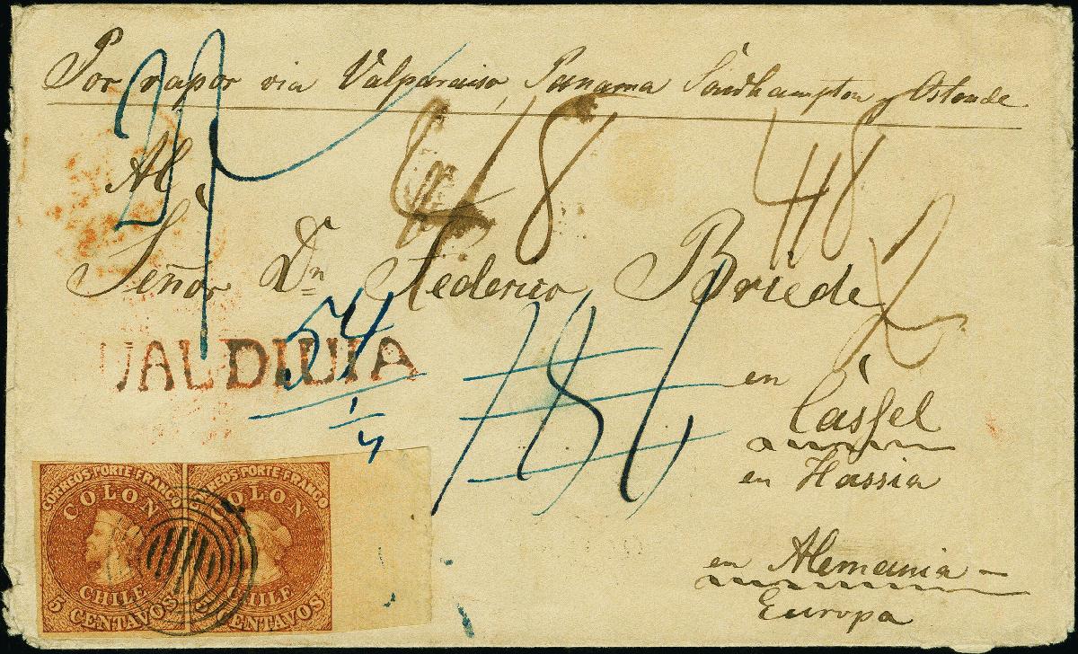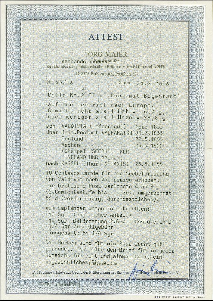 | Zusatzinformationen und Suchstichworte: | Heinrich Köhler 382. Auktion 18. - 23. September 2023 Los 1799 Chile 5 c. burnt sienna,horizontal marginal pair, the left stamps slightly shaved at top right, otherwise both stamps with full to large margins including enormous 14mm sheet margin at right, with clear central target on double rate cover with adjacent red straight-line “VALDIVIA” to Cassel in Hessia, Germany. On reverse transit mark of the British PO at Valparaiso and red “SEEBRIEF PER ENGLAND UND AACHEN”. Upon arrivalcharged with a total of 54 sgr. plus ¼ sgr. delivery fee.very fine. An outstanding and very fine letter; the only recorded entire with the Gillet issue to Germany. certificates Maier BPP (2006) and Moorhouse (2010) (Scott4) Ausruf 3.000,00 EUR |