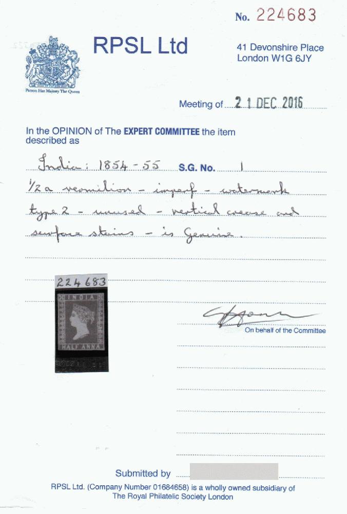 | Zusatzinformationen und Suchstichworte: | Stampbay 10. Auktion 16. September 2023 Los 37 Indien India 1854 first issues: ½a vermillion 9½ arches, wmk part Coat of Arms, prepared for use but not officially issued - without gum as issued, SG 1 £3500 - 2016 RPSL certificate Ausruf 1,00,00 USD |