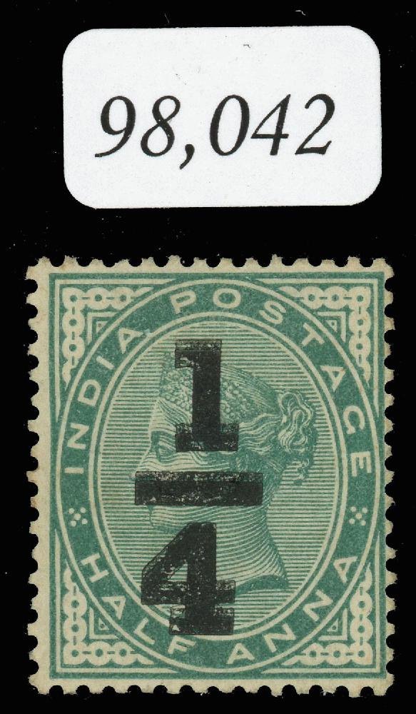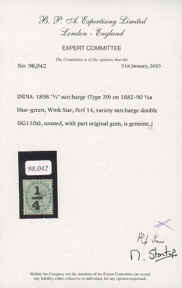 | Zusatzinformationen und Suchstichworte: | Stampbay 10. Auktion 16. September 2023 Los 130 Indien India 1898 QV "¼" on ½a blue-green, wmk star, variety: surcharge double, mint. SG 110a £750 - 2023 BPA certificate Los 1,00 USD |