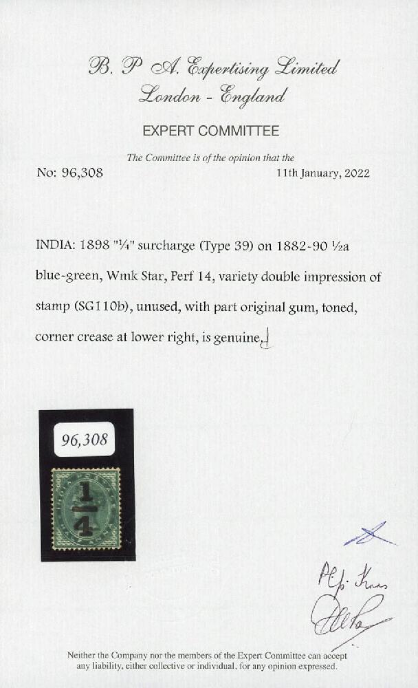 | Zusatzinformationen und Suchstichworte: | Stampbay 10. Auktion 16. September 2023 Los 131 Indien India 1898 QV ¼ on ½a blue green, variety: double impression of stamp, mint SG110b £750 - 2022 BPA certificate Ausruf 1,00 USD |