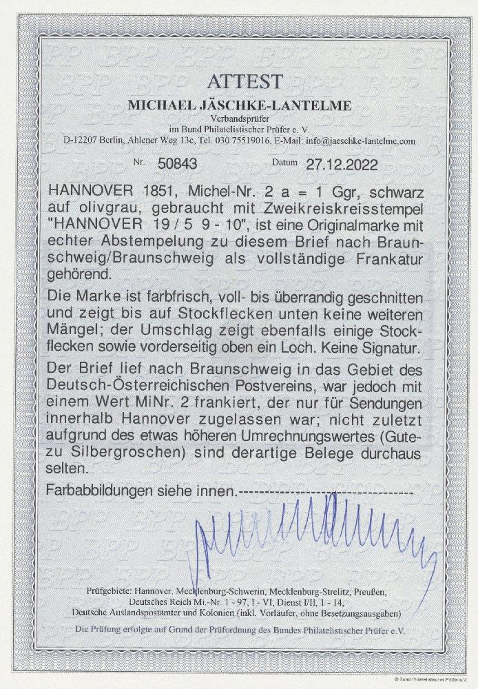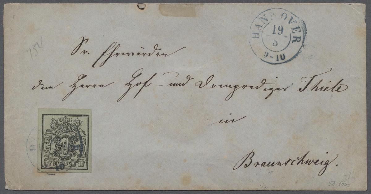 | Zusatzinformationen und Suchstichworte: | Auction Galleries Hamburg 29. Auktion 1. - 2. September 2023 Los 743 D Altdeutschland Hannover 1851, Freimarke 1 Ggr. schwarz auf olivgrau entwertet mit blauem K2 "Hannover 19/5" als Einzelfrankatur auf Briefumschlag nach Braunschweig. Der Brief lief nach Braunschweig in das Gebiet des Deutsch-Österreichischen Postvereins, war jedoch mit einem Wert Mi.Nr. 2 frankiert, der nur für Sendungen innerhalb Hannover zugelassen war; nicht zuletzt aufgrund des höheren Umrechnungswertes (Gute- zu Silbergroschen) sind derartige Belege durchaus selten. Laut neuestem Fotoattest Jäschke-Lantelme BPP ist die Marke farbfrisch, voll- bis überrandig geschnitten und zeigt bis auf Stockflecken unten keine weiteren Mängel; der Umschlag zeigt ebenfalls einige Stockflecken sowie vorderseitig oben ein Loch Ausruf 500,00 EUR |