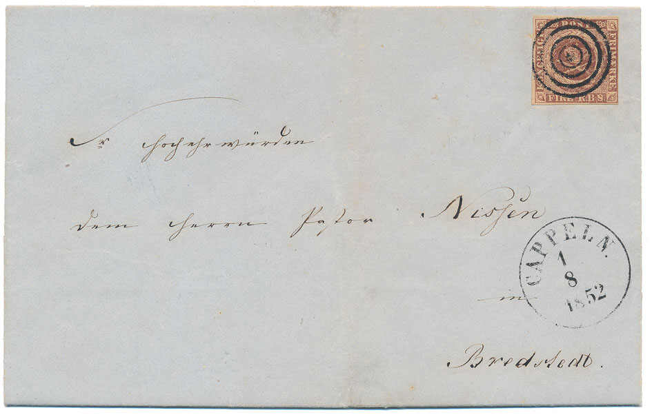 | Zusatzinformationen und Suchstichworte: | Postiljonen 239. Int. Briefmarken Auktion 26. - 29. September 2023 Los 68 Dänemark Earliest recorded use of antiqua III cds. "CAPPELN 1.8 1852" on cover with 4 RBS Ferslew plate I No. 46 sent to Bredstedt. Distinct mute canc. Cert. Møller. SUPERB Ausruf 200,00 EUR |