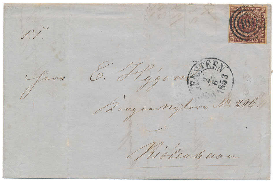 | Zusatzinformationen und Suchstichworte: | Postiljonen 239. Int. Briefmarken Auktion 26. - 29. September 2023 Los 69 Dänemark Cover with 4 RBS Ferslew with rare numeral canc. "101" and antiqua III cds. "GRAVENSTEIN 2.6 1853" sent to Copenhagen. Certs Debo and Møller. VERY RARE. Ausruf 500,00 EUR |