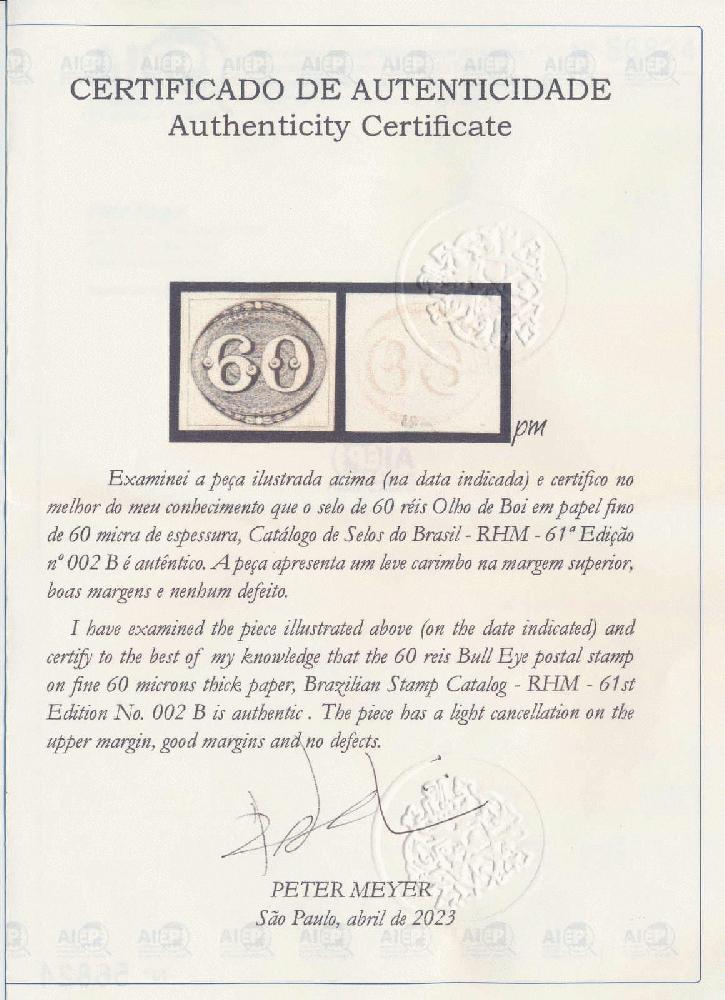 | Zusatzinformationen und Suchstichworte: | Postiljonen 239. Int. Briefmarken Auktion 26. - 29. September 2023 Los 15 Brasilien Very fresh 60 reis on thick paper (60 microns). light trace of canc. in the upper margin. RHM No. 2B. Cert. Peter Meyer & sign. Brun. VERY FINE. Ausruf 150,00 EUR |