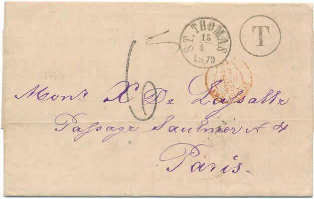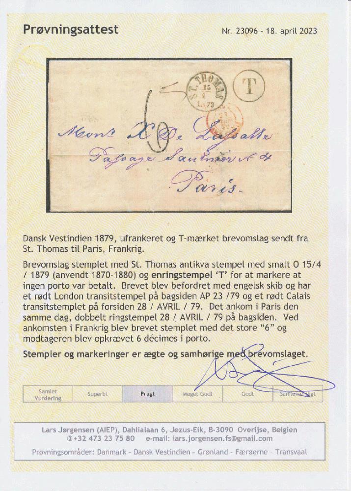 | Zusatzinformationen und Suchstichworte: | Postiljonen 239. Int. Briefmarken Auktion 26. - 29. September 2023 Los 692 Dänisch Westindien A very beautiful unpaid cover with contents to France from "ST. THOMAS 15.4 1879" via England. On front "T", French transit canc. and due mark "6". On back transit London and arrival marks. Cert. Lars Jørgensen. SUPERB COVER. Ausruf 150,00 EUR |