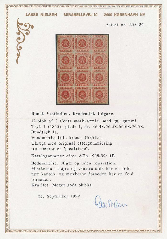 | Zusatzinformationen und Suchstichworte: | Postiljonen 239. Int. Briefmarken Auktion 26. - 29. September 2023 Los 694 Dänisch Westindien A very fresh and beautiful block of twelve of 1 cent with yellow gum, put on in St. Thomas. Three stamps are never hinged. Some other stamps with folds along the margins at left and bottom, which does not affect the beauty of this block. Good margins all around. One of the largest multiples with yellow gum. Cert. Lasse Nielsen. VERY FINE EXHIBITION RARITY. Ausruf 2.000,00 EUR |