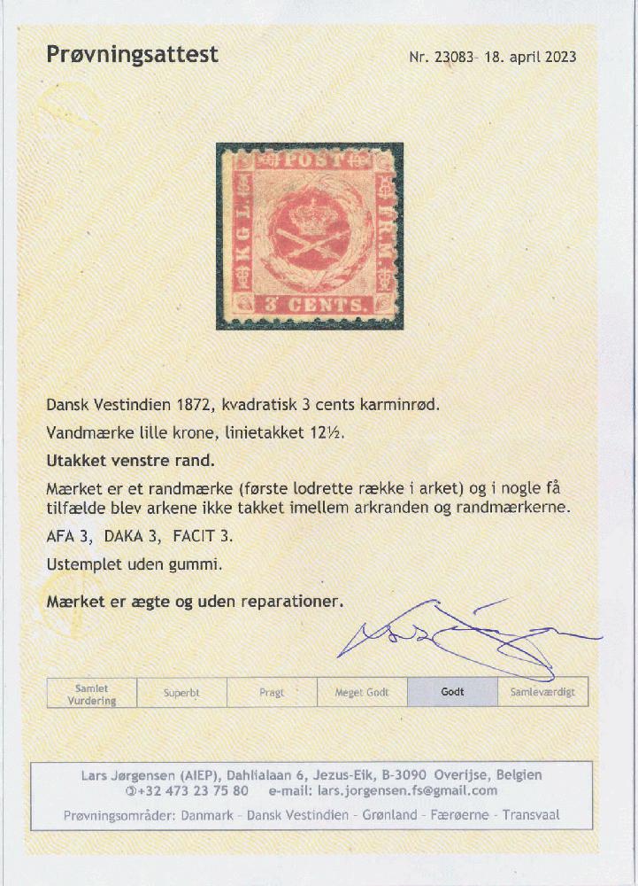 | Zusatzinformationen und Suchstichworte: | Postiljonen 239. Int. Briefmarken Auktion 26. - 29. September 2023 Los 699 Dänisch Westindien Rare 3 cents carmine red imperforate at left without gum. Not priced in Facit. Cert. Jørgensen. FINE & RARE. Ausruf 500,00 EUR |