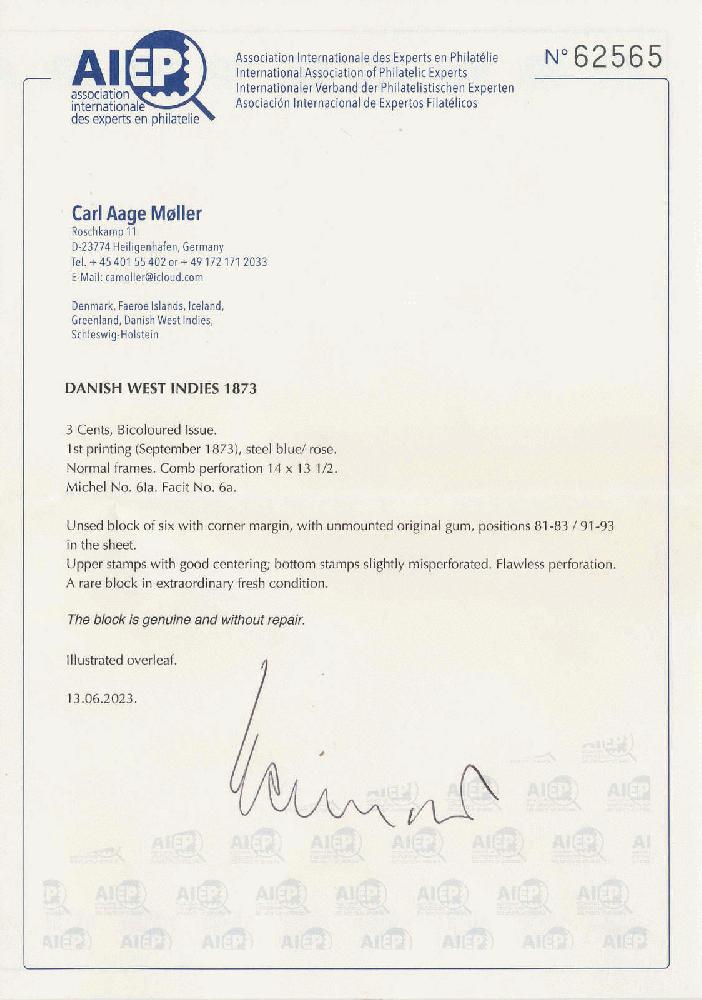 | Zusatzinformationen und Suchstichworte: | Postiljonen 239. Int. Briefmarken Auktion 26. - 29. September 2023 Los 709 Dänisch Westindien Full corner margin block of six, pos. 81-83/91-93. Outstanding freshness. F=13.000. Cert. Møller. A VERY RARE BLOCK. Ausruf 500,00 EUR |