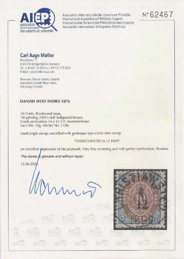 | Zusatzinformationen und Suchstichworte: | Postiljonen 239. Int. Briefmarken Auktion 26. - 29. September 2023 Los 733 Dänisch Westindien Excellent grotesque cds. "CHRISTIANSTED 4.12 1899" on 10 cents 7th printing. Cert. Møller. SUPERB. Ausruf 100,00 EUR |