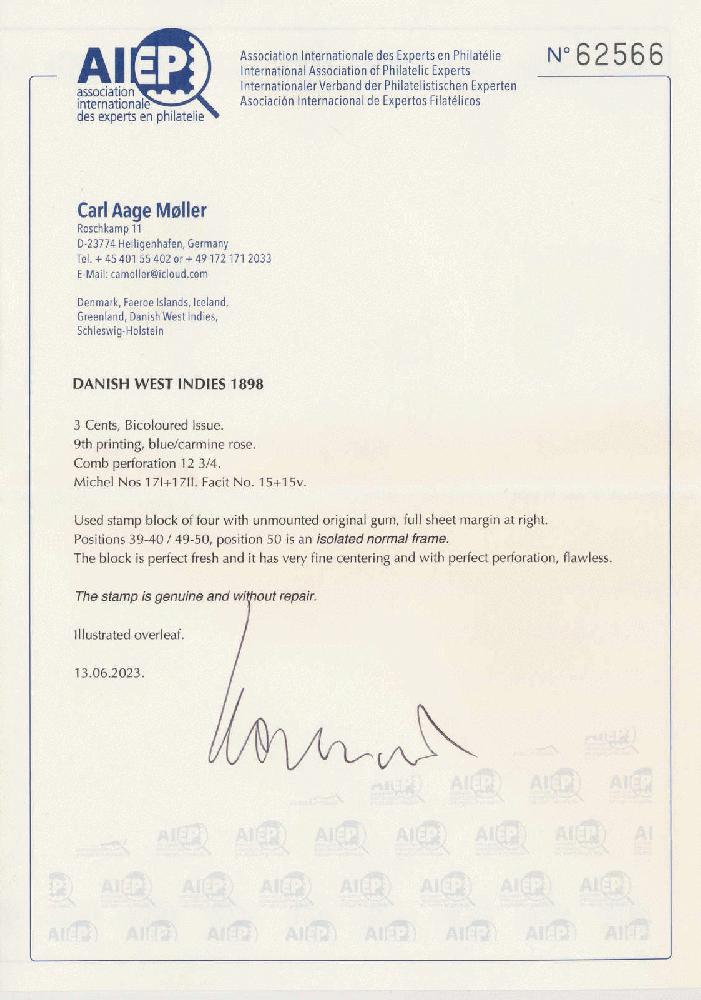 | Zusatzinformationen und Suchstichworte: | Postiljonen 239. Int. Briefmarken Auktion 26. - 29. September 2023 Los 746 Dänisch Westindien Margin block of four 3 cents perf. 12 3/4 pos. 39-40+49-50 with NORMAL FRAME in pos. 50. F=8.000. Cert. Møller. VERY FINE & RARE. GEBOT |